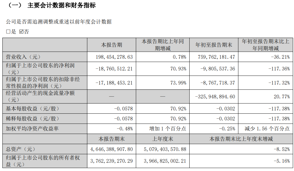 其中第三季度,公司营业收入1.98亿元,同比增长0.78%;归母净利润自去年同期亏损6453万元变为亏损1876万元,亏损额有所减少;扣非归母净利润自去年同期亏损6610万元变为亏损1719万元,亏损额有所减少。