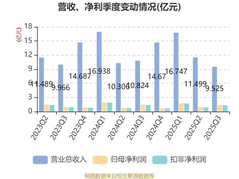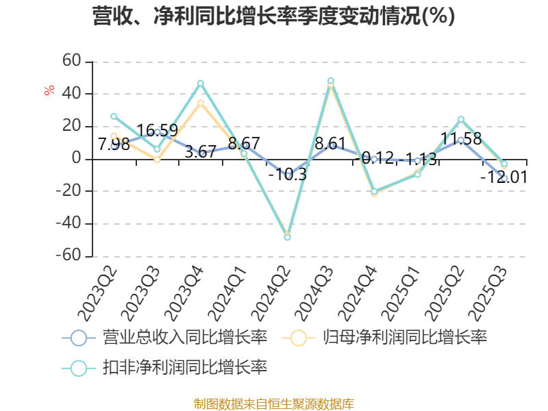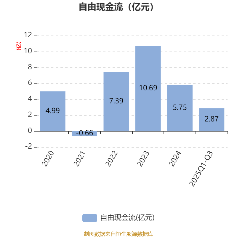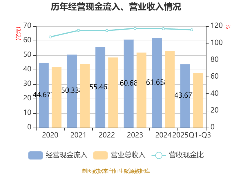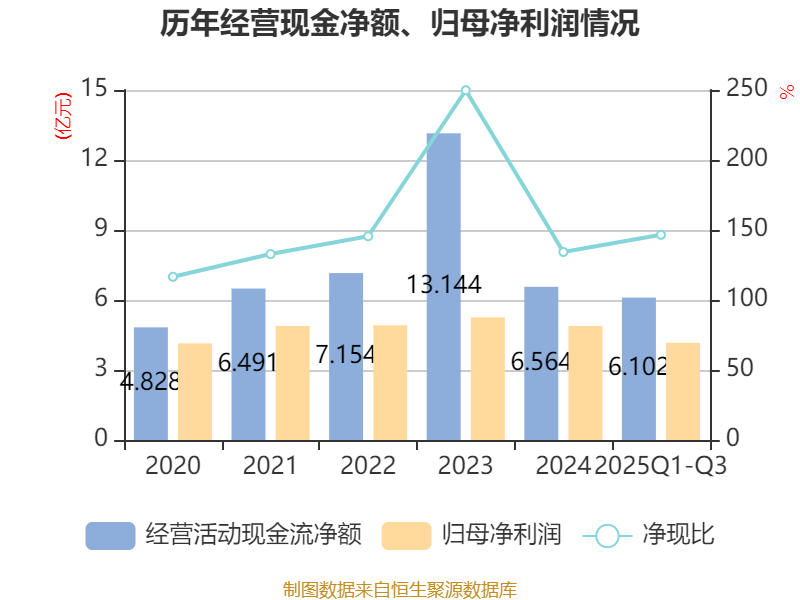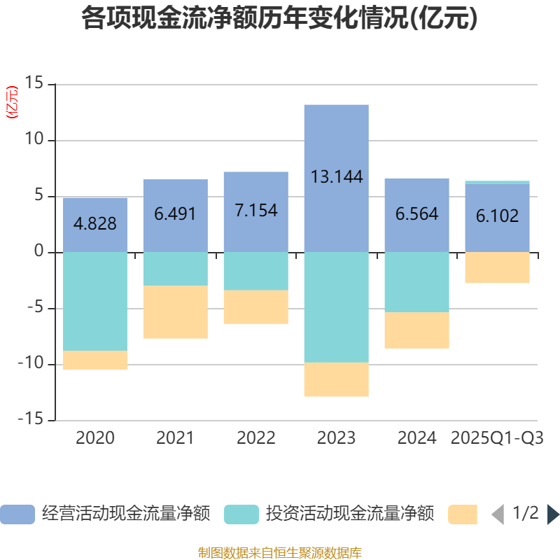 2025年前三季度,公司经营活动现金流净额为6.1亿元,同比下降15.46%;筹资活动现金流净额-2.77亿元,同比增加1146.77万元;投资活动现金流净额2511.23万元,上年同期为-4.41亿元。