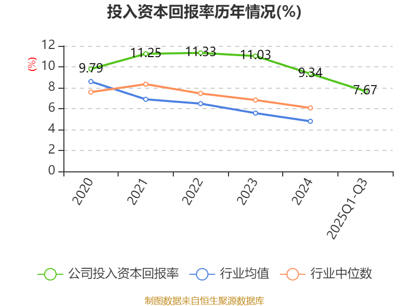 盈利能力方面, 2025年前三季度公司加权平均净资产收益率为8.69%,同比下降0.53个百分点。公司2025年前三季度投入资本回报率为7.67%,较上年同期下降0.41个百分点。