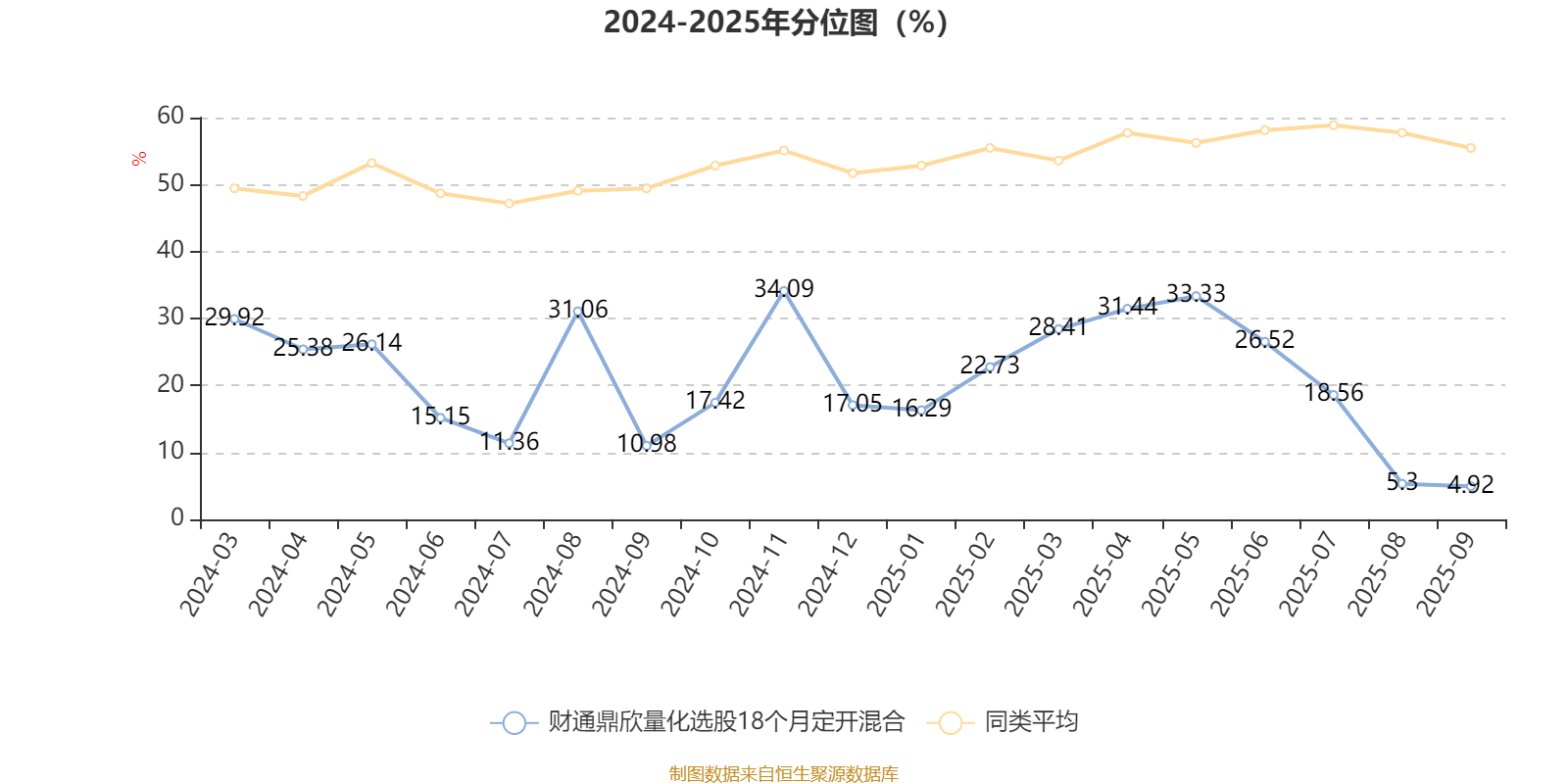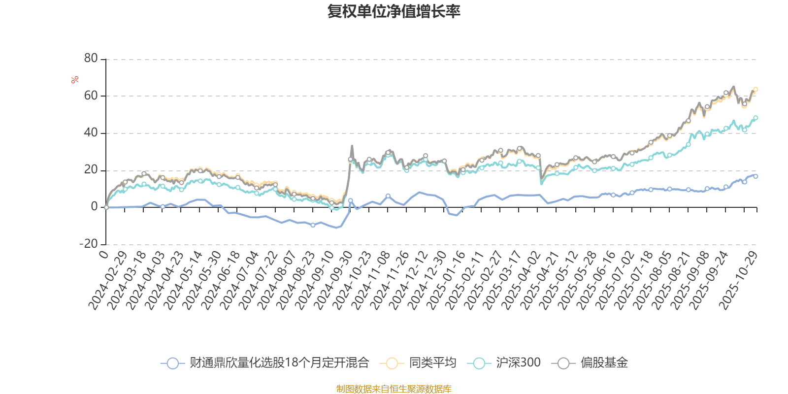 截至10月29日,财通鼎欣量化选股18个月定开混合近三个月复权单位净值增长率为6.42%,位于同类可比基金222/265;近半年复权单位净值增长率为11.63%,位于同类可比基金243/265;近一年复权单位净值增长率为13.26%,位于同类可比基金231/265。