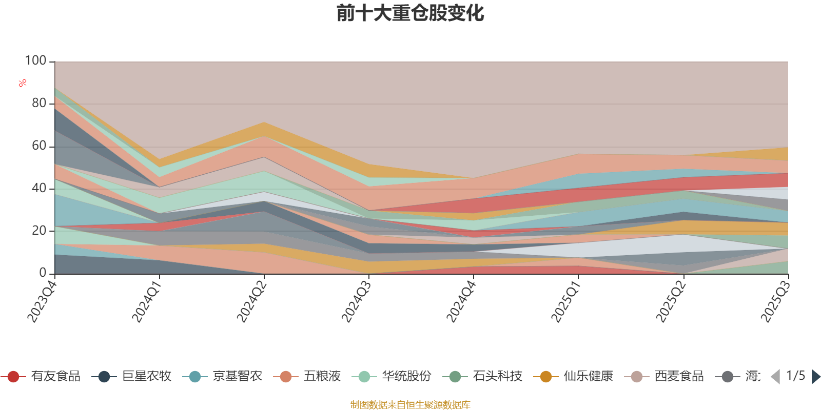 截至2025年三季度末,基金十大重仓股分别是百亚股份、今世缘、新乳业、潮宏基、西麦食品、众鑫股份、老白干酒、石头科技、比亚迪、安琪酵母。