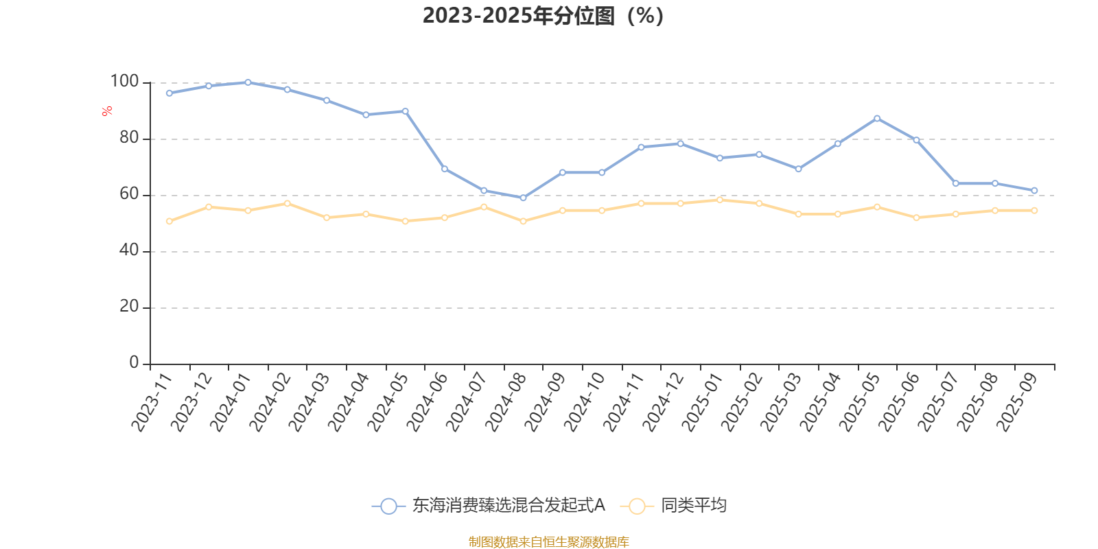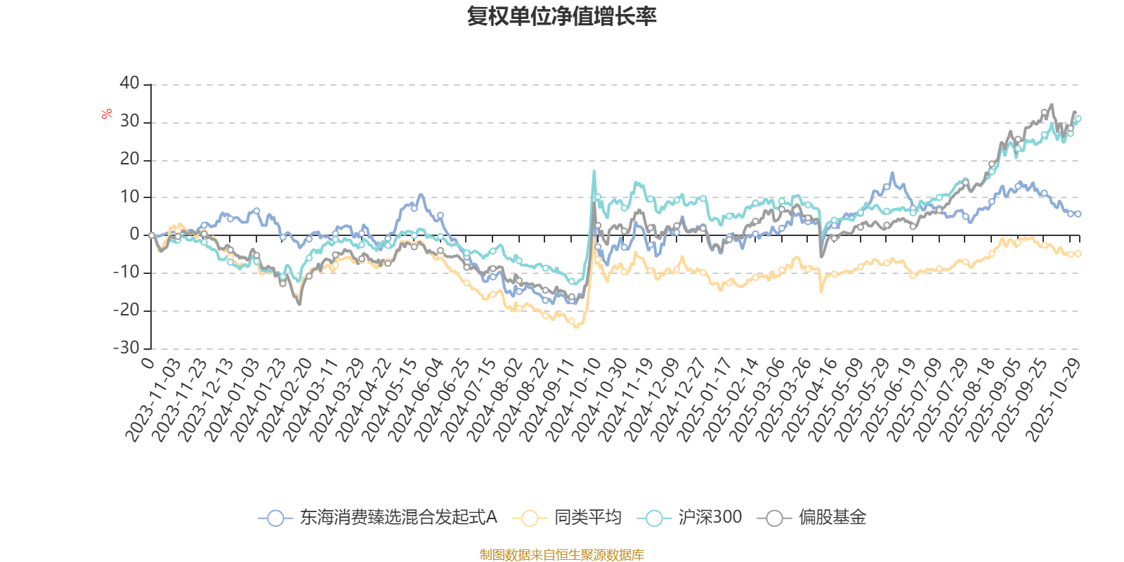 截至10月29日,东海消费臻选混合发起式A近三个月复权单位净值增长率为0.61%,位于同类可比基金54/85;近半年复权单位净值增长率为-0.14%,位于同类可比基金66/85;近一年复权单位净值增长率为7.94%,位于同类可比基金39/82。