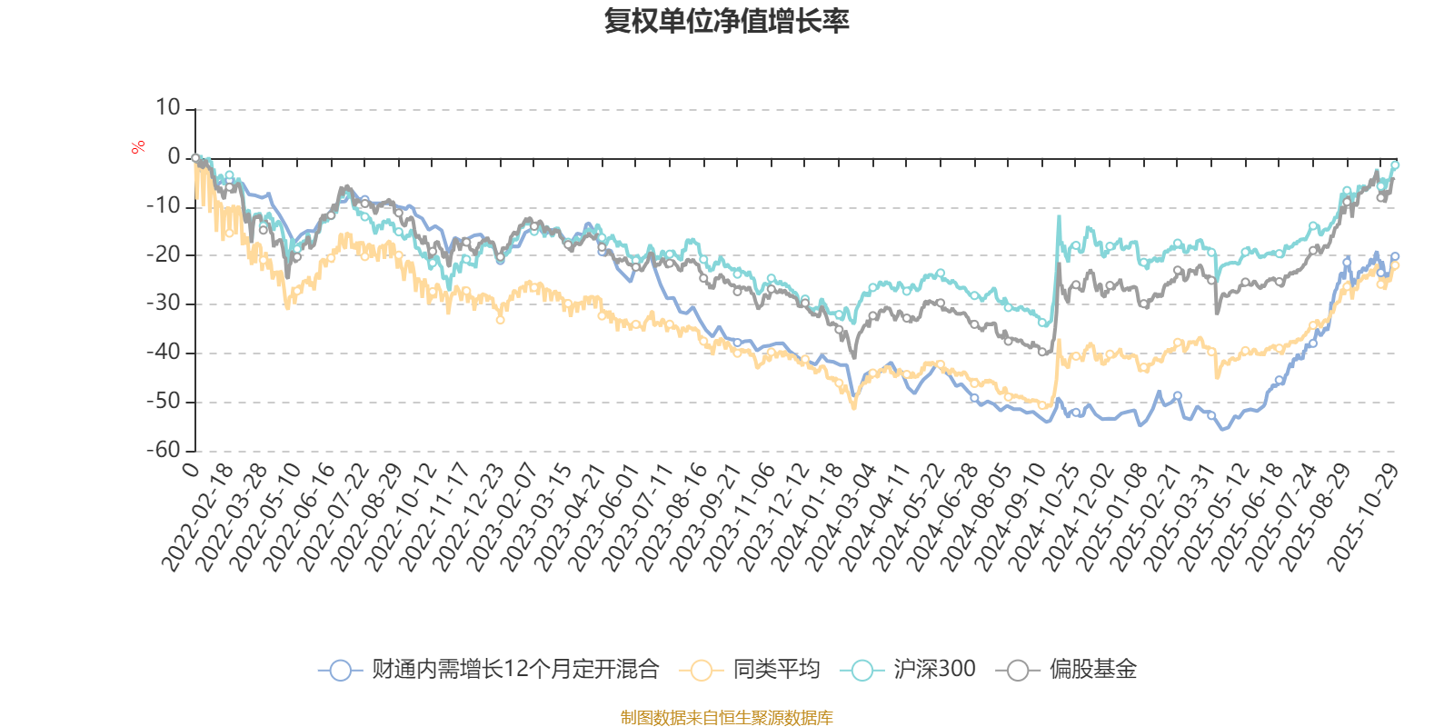 截至10月29日,财通内需增长12个月定开混合近三个月复权单位净值增长率为22.76%,位于同类可比基金157/621;近半年复权单位净值增长率为69.24%,位于同类可比基金37/621;近一年复权单位净值增长率为68.22%,位于同类可比基金36/611;近三年复权单位净值增长率为-0.82%,位于同类可比基金433/518。