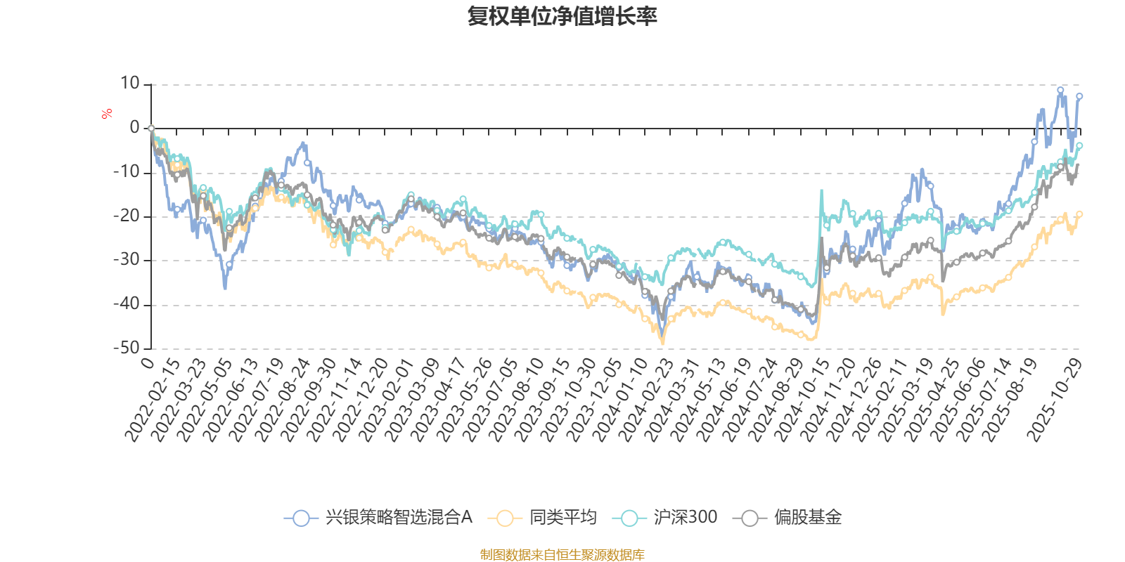 截至10月29日,兴银策略智选混合A近三个月复权单位净值增长率为19.04%,位于同类可比基金220/689;近半年复权单位净值增长率为38.58%,位于同类可比基金190/688;近一年复权单位净值增长率为50.97%,位于同类可比基金94/657;近三年复权单位净值增长率为32.16%,位于同类可比基金96/364。