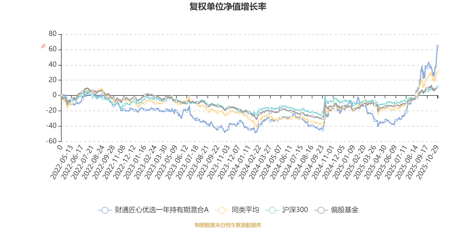 截至10月29日,财通匠心优选一年持有期混合A近三个月复权单位净值增长率为69.93%,位于同类可比基金2/229;近半年复权单位净值增长率为150.05%,位于同类可比基金7/229;近一年复权单位净值增长率为101.70%,位于同类可比基金24/213;近三年复权单位净值增长率为104.71%,位于同类可比基金17/158。