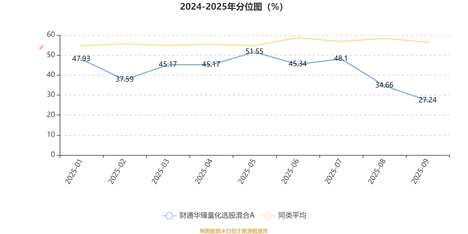 通过所选区间该基金净值增长率分位图,可以观察该基金与同类基金业绩比较情况。图为坐标原点到区间内某时点的净值增长率在同类基金中的分位数。