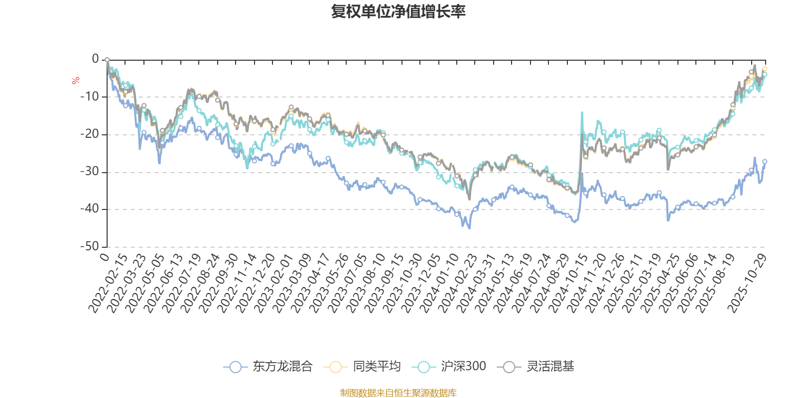 截至10月29日,东方龙混合近三个月复权单位净值增长率为15.86%,位于同类可比基金504/1287;近半年复权单位净值增长率为21.67%,位于同类可比基金736/1287;近一年复权单位净值增长率为10.43%,位于同类可比基金972/1287;近三年复权单位净值增长率为1.91%,位于同类可比基金1002/1286。