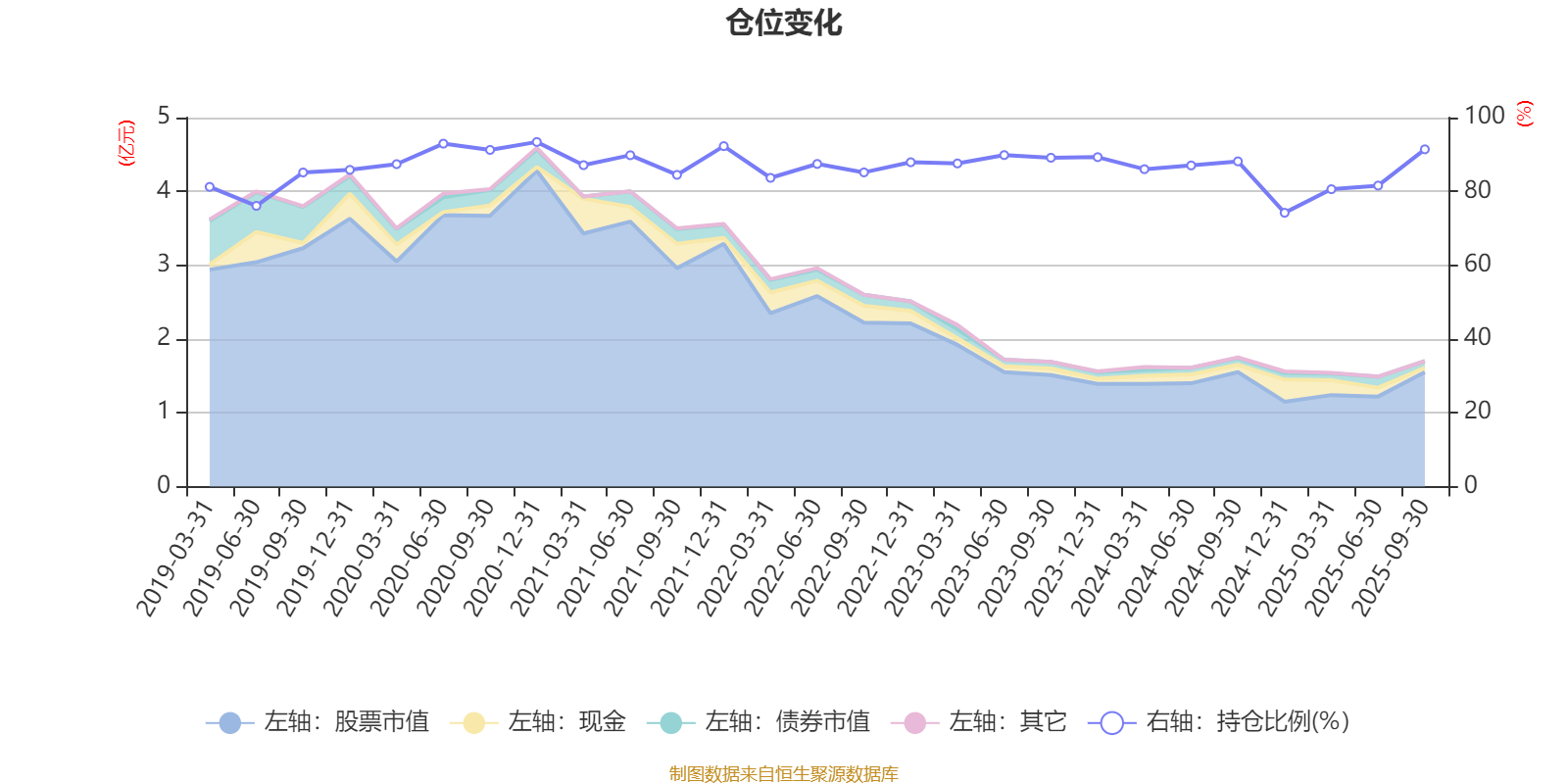 据定期报告数据统计,近三年平均股票仓位为86.06%,同类平均为72.35%。2020年末基金达到93.39%的最高仓位,2024年末最低,为74.2%。