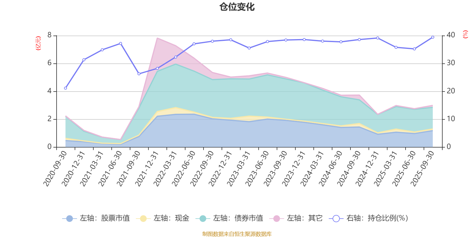 据定期报告数据统计,近三年平均股票仓位为37.72%,同类平均为19.14%。2025年三季度末基金达到39.42%的最高仓位,2020年三季度末最低,为21.14%。