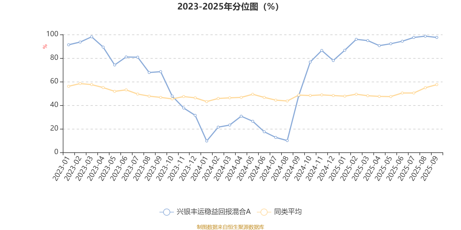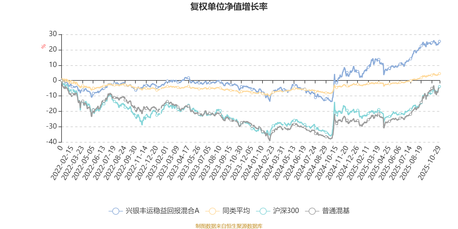 截至10月29日,兴银丰运稳益回报混合A近三个月复权单位净值增长率为5.03%,位于同类可比基金118/629;近半年复权单位净值增长率为16.73%,位于同类可比基金26/629;近一年复权单位净值增长率为22.22%,位于同类可比基金20/623;近三年复权单位净值增长率为32.90%,位于同类可比基金19/557。