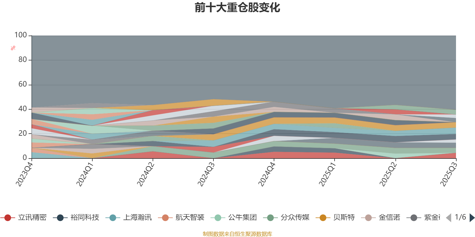 截至2025年三季度末,基金十大重仓股分别是宁德时代、海康威视、万华化学、立讯精密、腾讯控股、分众传媒、九丰能源、杭叉集团、中天科技、美的集团。