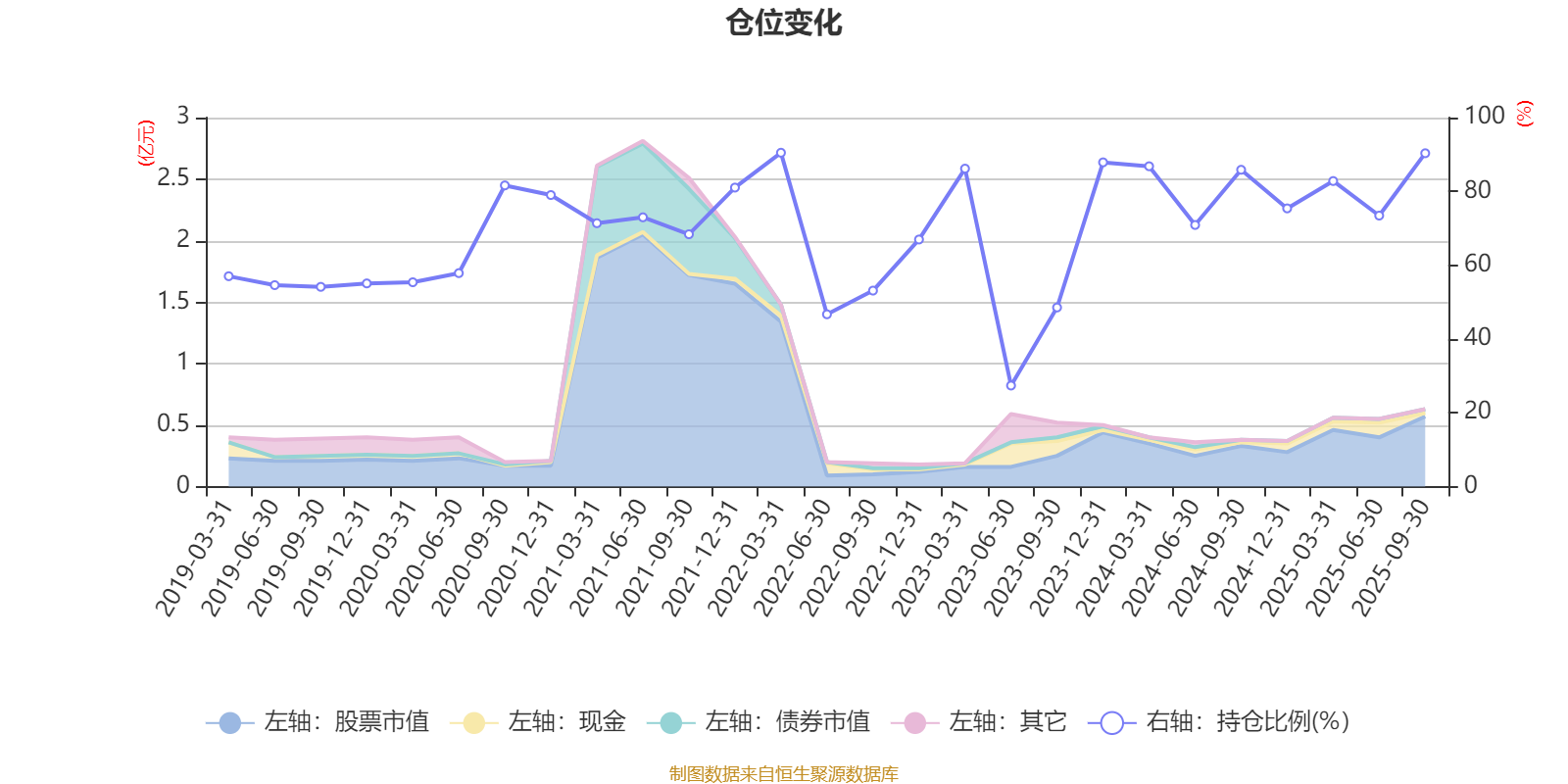 据定期报告数据统计,近三年平均股票仓位为73.54%,同类平均为72.35%。2022年一季度末基金达到90.48%的最高仓位,2023年上半年末最低,为27.38%。