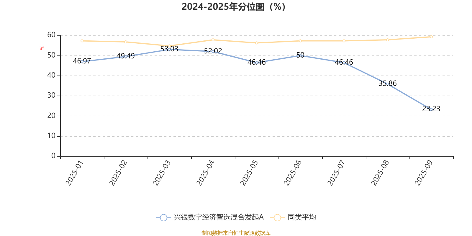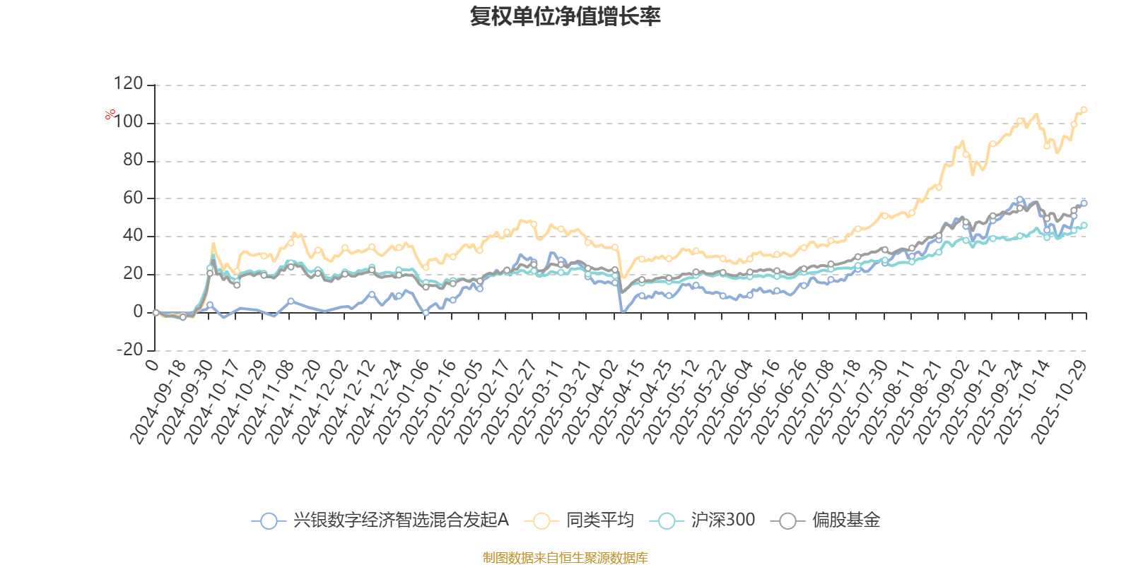 截至10月29日,兴银数字经济智选混合发起A近三个月复权单位净值增长率为23.04%,位于同类可比基金171/229;近半年复权单位净值增长率为43.36%,位于同类可比基金153/229;近一年复权单位净值增长率为55.54%,位于同类可比基金115/213。