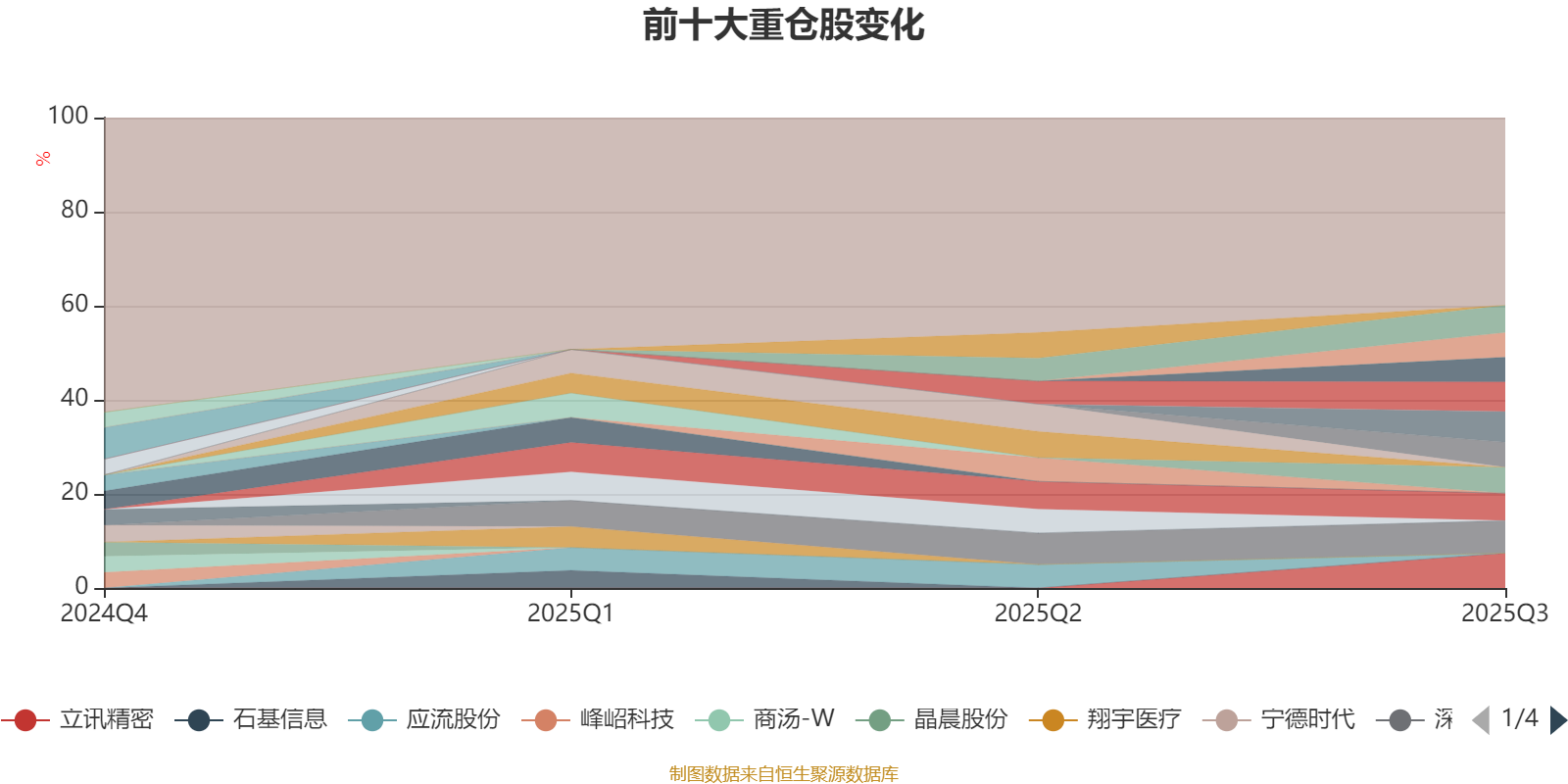 截至2025年三季度末,基金十大重仓股分别是立讯精密、深信服、沪电股份、阿里巴巴-W、用友网络、兆易创新、长川科技、顺络电子、艾为电子、赛微电子。