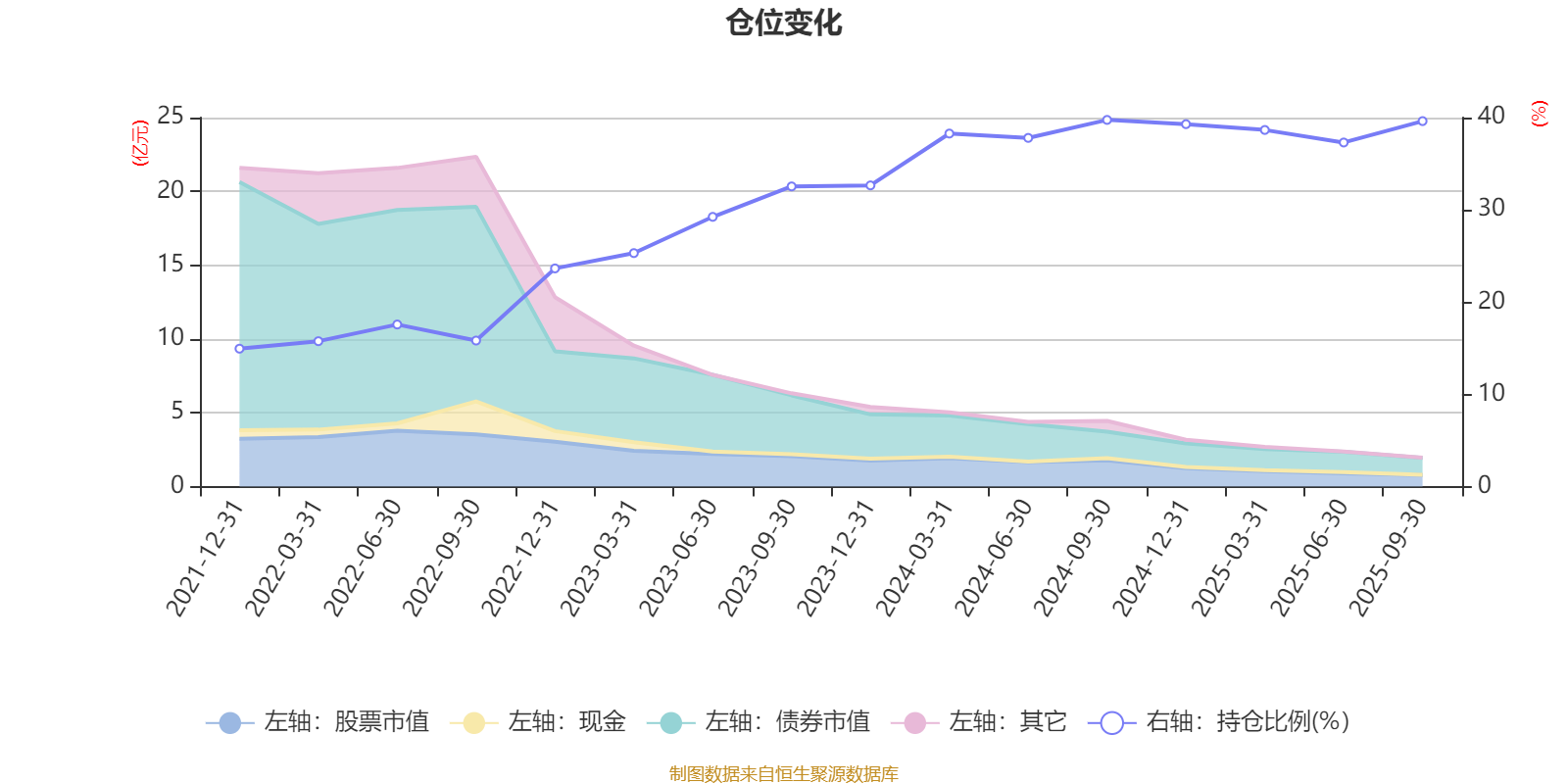 据定期报告数据统计,近三年平均股票仓位为34.51%,同类平均为19.14%。2024年三季度末基金达到39.75%的最高仓位,2021年末最低,为14.95%。