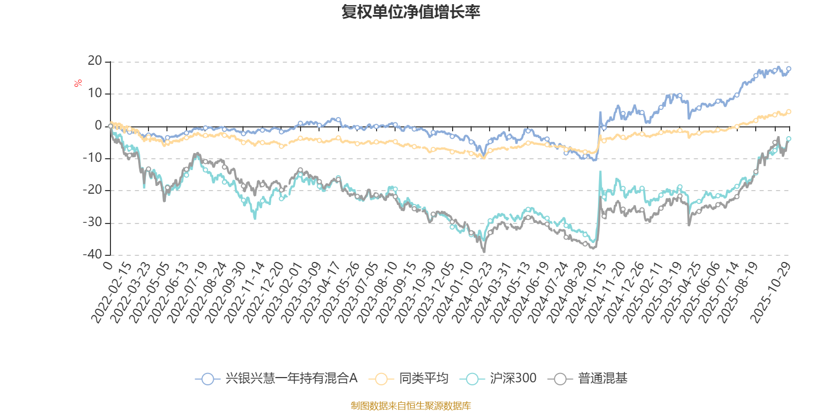 截至10月29日,兴银兴慧一年持有混合A近三个月复权单位净值增长率为3.53%,位于同类可比基金215/629;近半年复权单位净值增长率为11.72%,位于同类可比基金70/629;近一年复权单位净值增长率为15.44%,位于同类可比基金54/623;近三年复权单位净值增长率为20.53%,位于同类可比基金93/557。