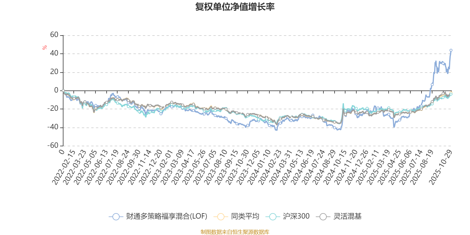 截至10月29日,财通多策略福享混合(LOF)近三个月复权单位净值增长率为50.50%,位于同类可比基金29/1287;近半年复权单位净值增长率为111.05%,位于同类可比基金16/1287;近一年复权单位净值增长率为84.58%,位于同类可比基金40/1287;近三年复权单位净值增长率为92.64%,位于同类可比基金32/1286。
