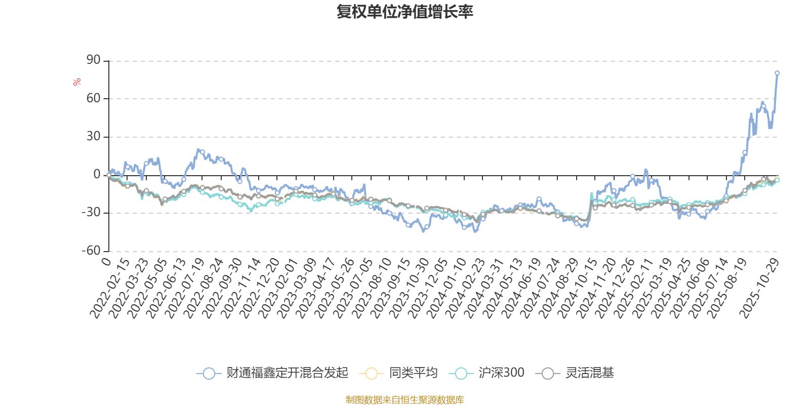截至10月29日,财通福鑫定开混合发起近三个月复权单位净值增长率为75.60%,位于同类可比基金1/1287;近半年复权单位净值增长率为154.62%,位于同类可比基金4/1287;近一年复权单位净值增长率为106.80%,位于同类可比基金11/1287;近三年复权单位净值增长率为103.46%,位于同类可比基金24/1286。