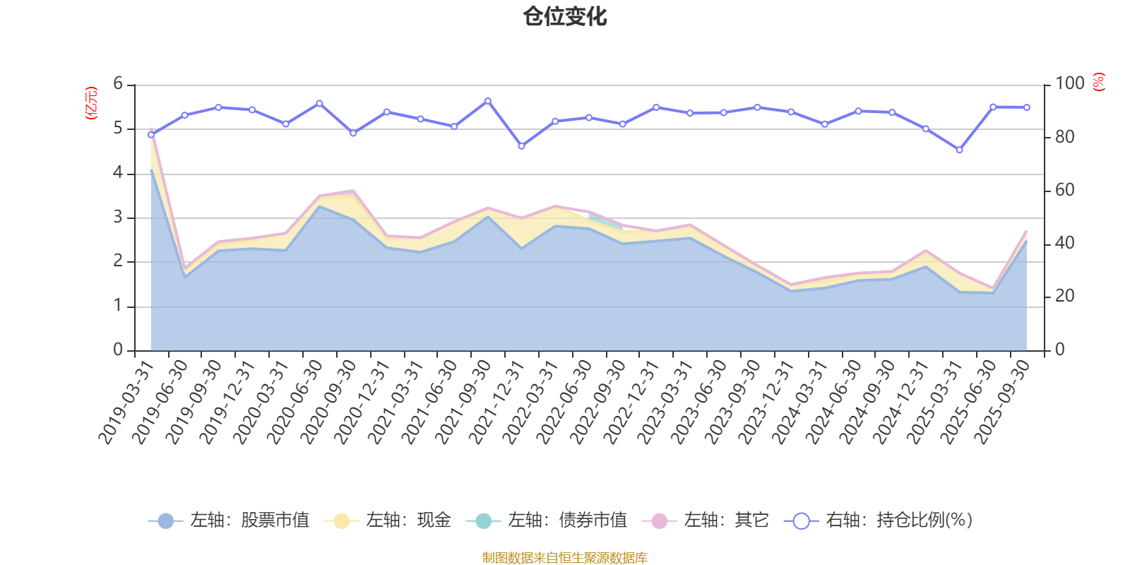 据定期报告数据统计,近三年平均股票仓位为88.22%,同类平均为72.35%。2021年三季度末基金达到93.9%的最高仓位,2025年一季度末最低,为75.52%。