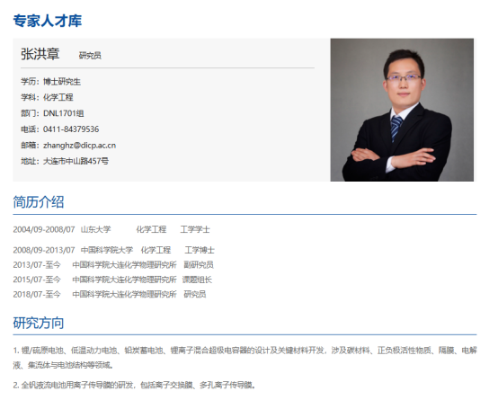 大连化物所官网显示,张洪章的研究方向包括锂/硫原电池、低温动力电池、铅炭蓄电池、锂离子混合超级电容器的设计及关键材料开发,涉及碳材料、正负极活性物质、隔膜、电解液、集流体与电池结构等领域。全钒液流电池用离子传导膜的研发,包括离子交换膜、多孔离子传导膜。