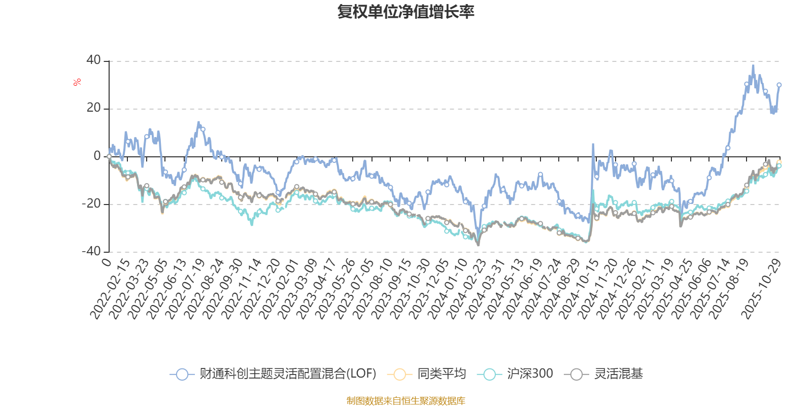 截至10月29日,财通科创主题灵活配置混合(LOF)近三个月复权单位净值增长率为10.98%,位于同类可比基金697/1287;近半年复权单位净值增长率为61.85%,位于同类可比基金103/1287;近一年复权单位净值增长率为36.02%,位于同类可比基金361/1287;近三年复权单位净值增长率为46.54%,位于同类可比基金189/1286。