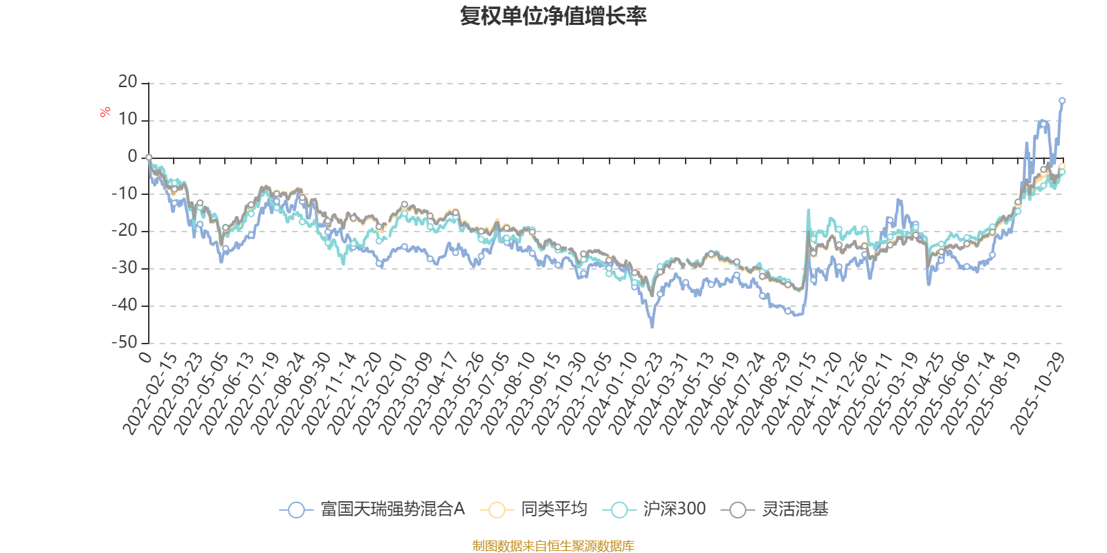 截至10月29日,富国天瑞强势混合A近三个月复权单位净值增长率为42.92%,位于同类可比基金65/1287;近半年复权单位净值增长率为58.63%,位于同类可比基金118/1287;近一年复权单位净值增长率为68.34%,位于同类可比基金75/1287;近三年复权单位净值增长率为48.06%,位于同类可比基金178/1286。