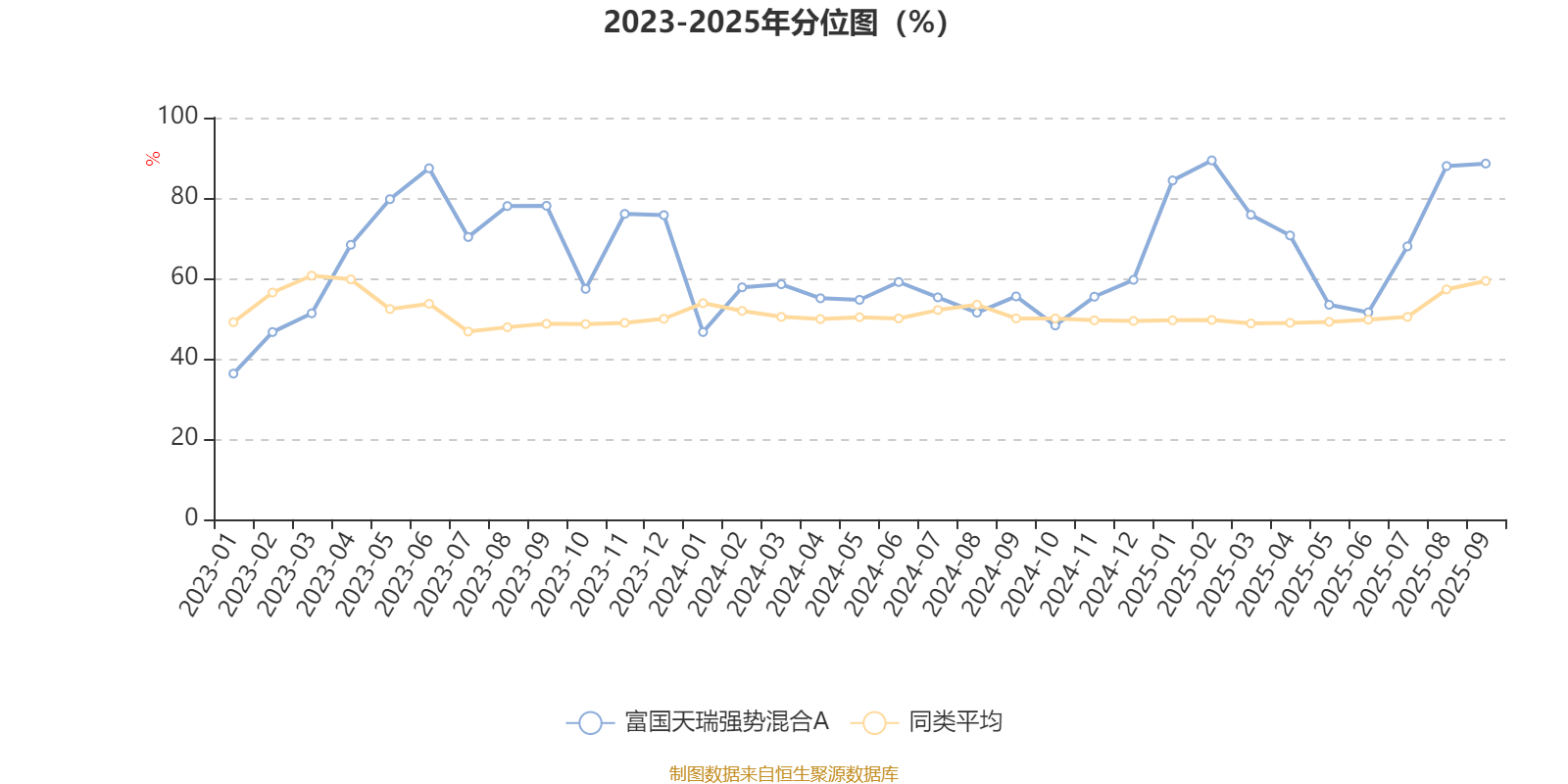 通过所选区间该基金净值增长率分位图,可以观察该基金与同类基金业绩比较情况。图为坐标原点到区间内某时点的净值增长率在同类基金中的分位数。