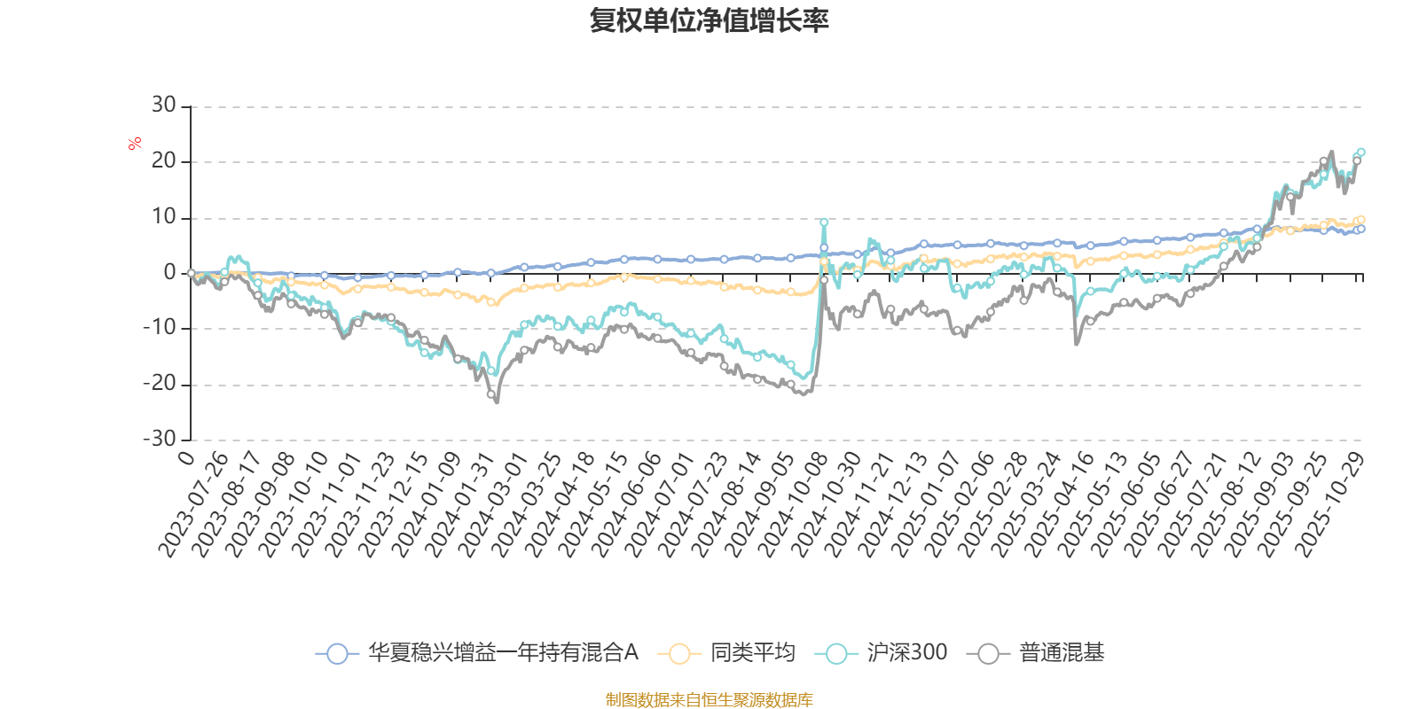 截至10月29日,华夏稳兴增益一年持有混合A近三个月复权单位净值增长率为0.73%,位于同类可比基金550/629;近半年复权单位净值增长率为2.64%,位于同类可比基金531/629;近一年复权单位净值增长率为4.40%,位于同类可比基金515/623。