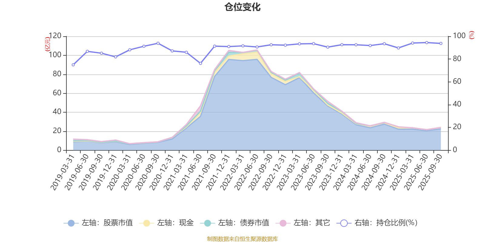 据定期报告数据统计,近三年平均股票仓位为92.69%,同类平均为72.35%。2025年上半年末基金达到94.47%的最高仓位,2019年一季度末最低,为74.95%。