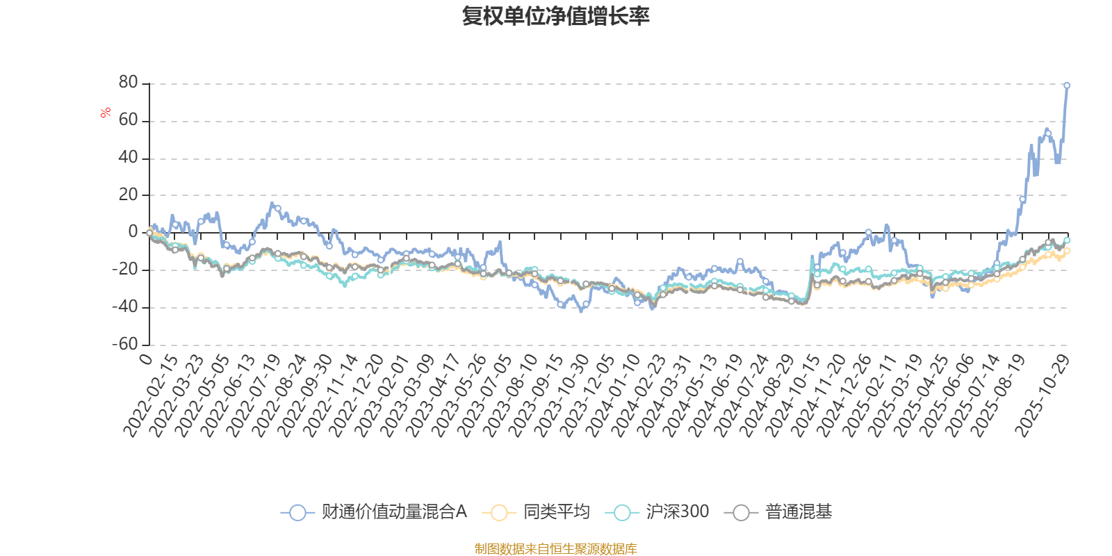 截至10月29日,财通价值动量混合A近三个月复权单位净值增长率为75.63%,位于同类可比基金2/134;近半年复权单位净值增长率为147.71%,位于同类可比基金2/134;近一年复权单位净值增长率为101.50%,位于同类可比基金1/130;近三年复权单位净值增长率为100.92%,位于同类可比基金1/119。
