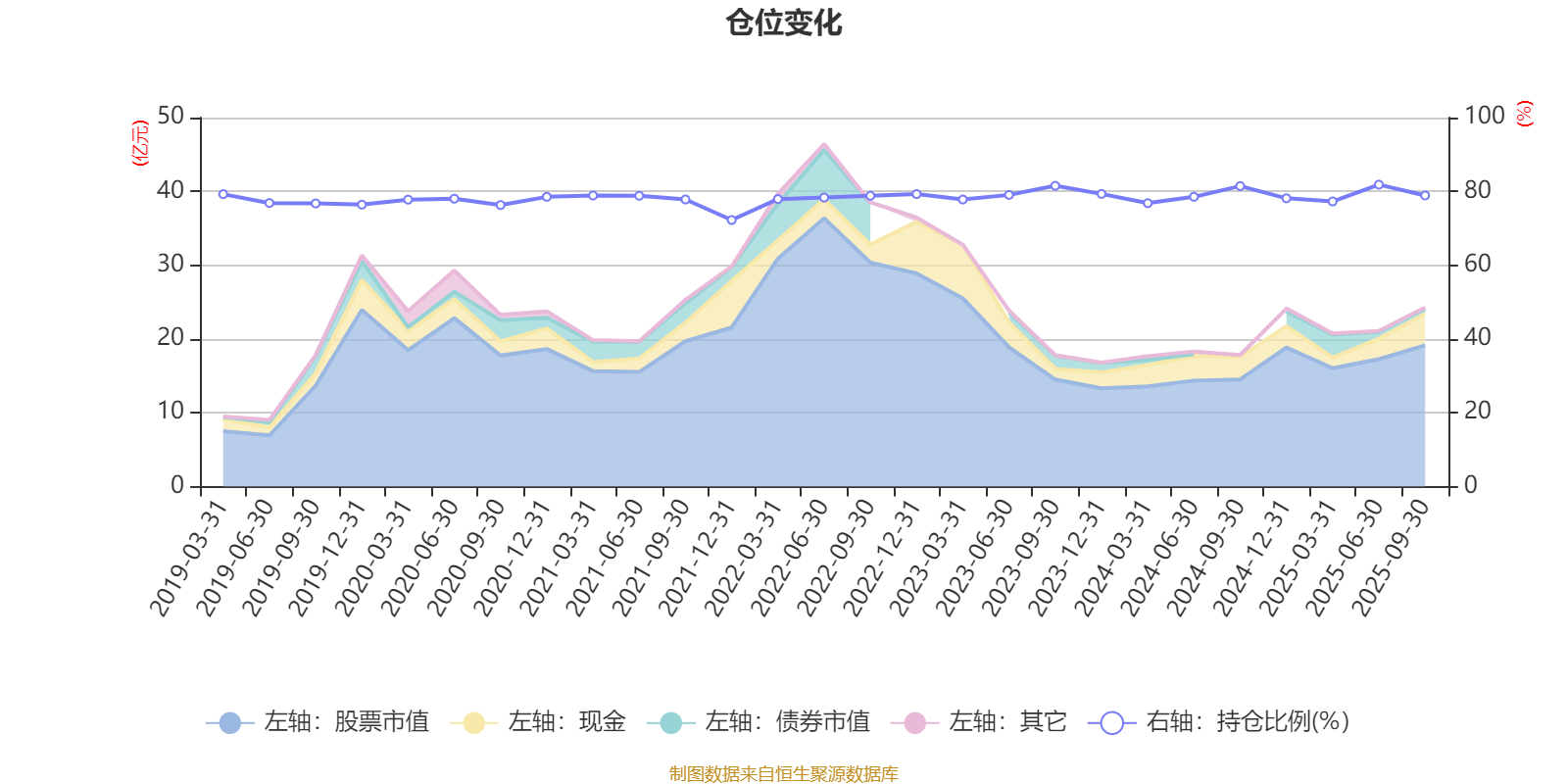 据定期报告数据统计,近三年平均股票仓位为79.16%,同类平均为67.37%。2025年上半年末基金达到81.83%的最高仓位,2021年末最低,为72.24%。