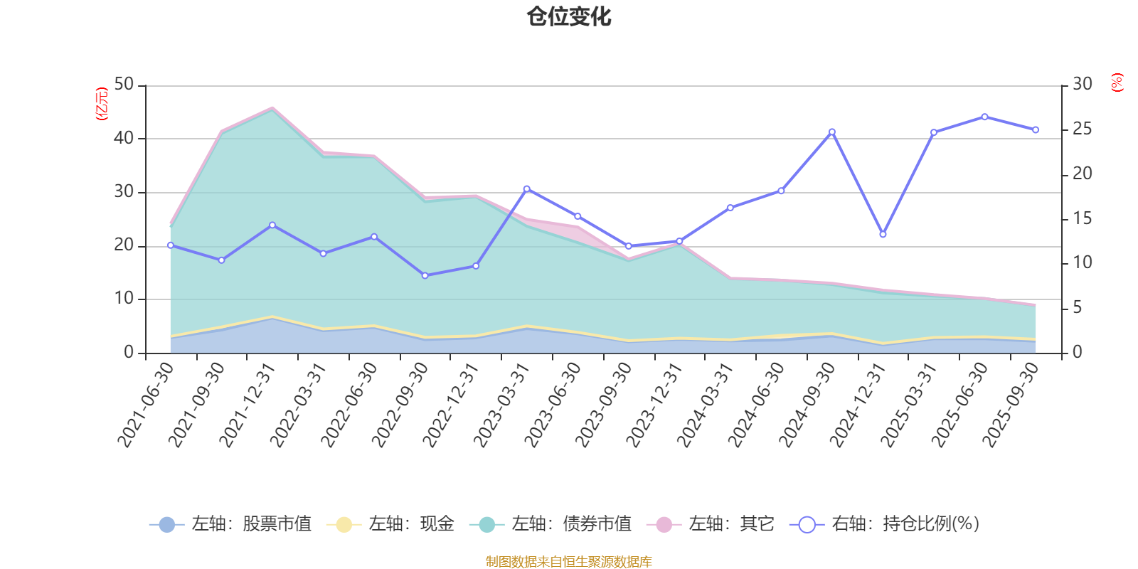 据定期报告数据统计,近三年平均股票仓位为18.07%,同类平均为19.14%。2025年上半年末基金达到26.48%的最高仓位,2022年三季度末最低,为8.69%。