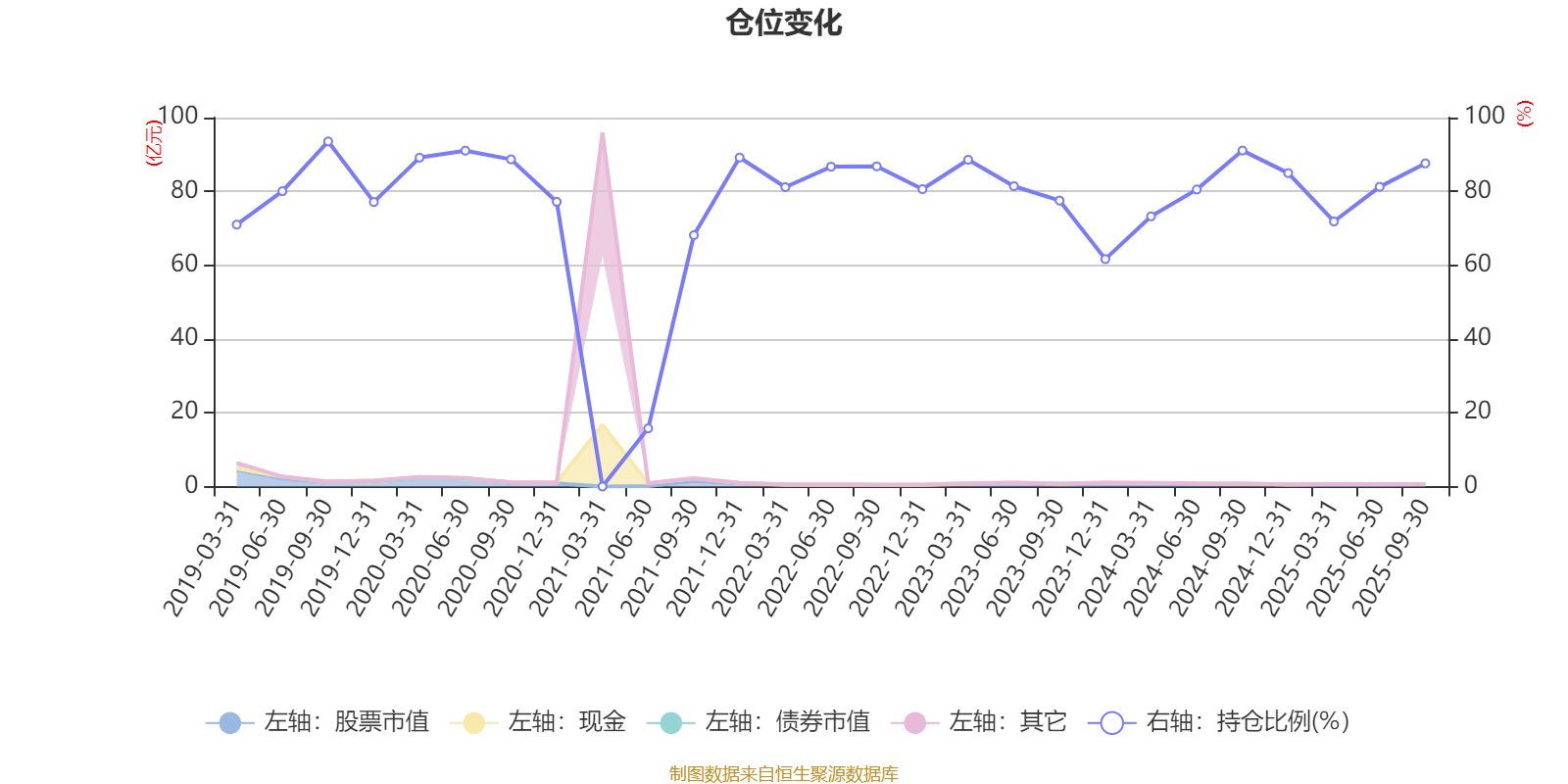 据定期报告数据统计,近三年平均股票仓位为80.02%,同类平均为72.35%。2019年三季度末基金达到93.54%的最高仓位,2021年一季度末最低,为0.02%。