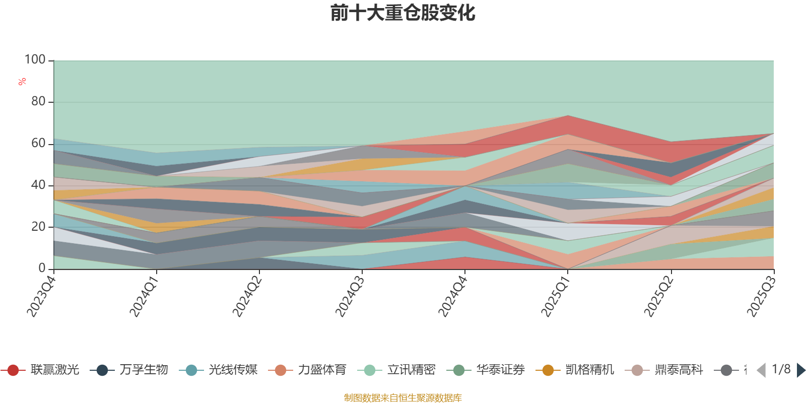 该基金持股集中度较高。截至2025年三季度末,基金十大重仓股分别是立讯精密、珠江股份、福晶科技、京新药业、力盛体育、新泉股份、伊之密、凯格精机、易德龙、四川双马。