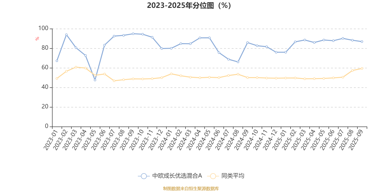 通过所选区间该基金净值增长率分位图,可以观察该基金与同类基金业绩比较情况。图为坐标原点到区间内某时点的净值增长率在同类基金中的分位数。