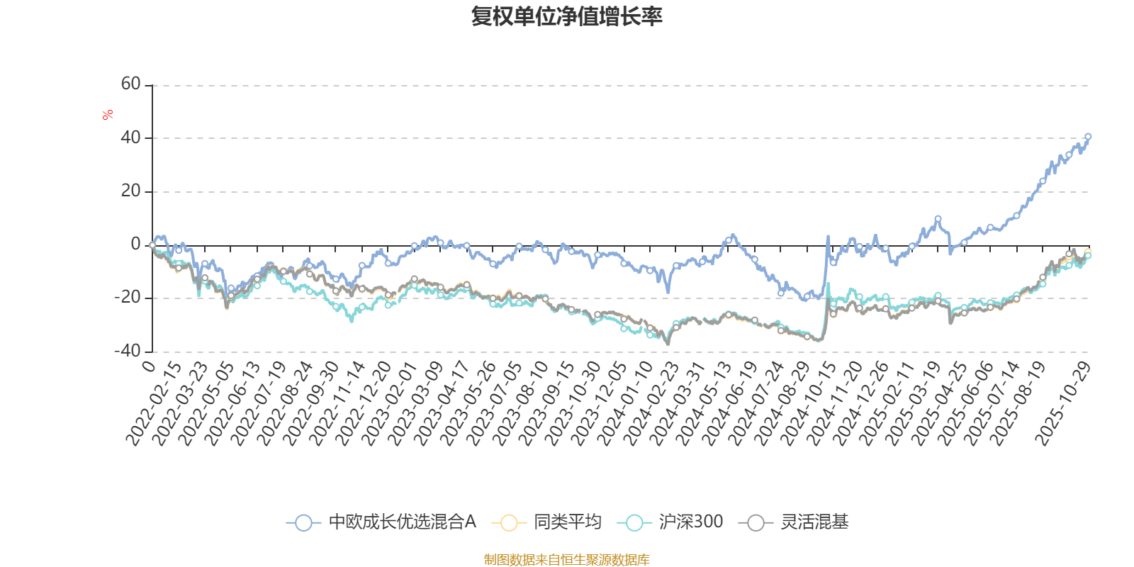 截至10月29日,中欧成长优选混合A近三个月复权单位净值增长率为20.92%,位于同类可比基金357/1287;近半年复权单位净值增长率为37.22%,位于同类可比基金363/1287;近一年复权单位净值增长率为43.51%,位于同类可比基金253/1287;近三年复权单位净值增长率为67.13%,位于同类可比基金86/1286。
