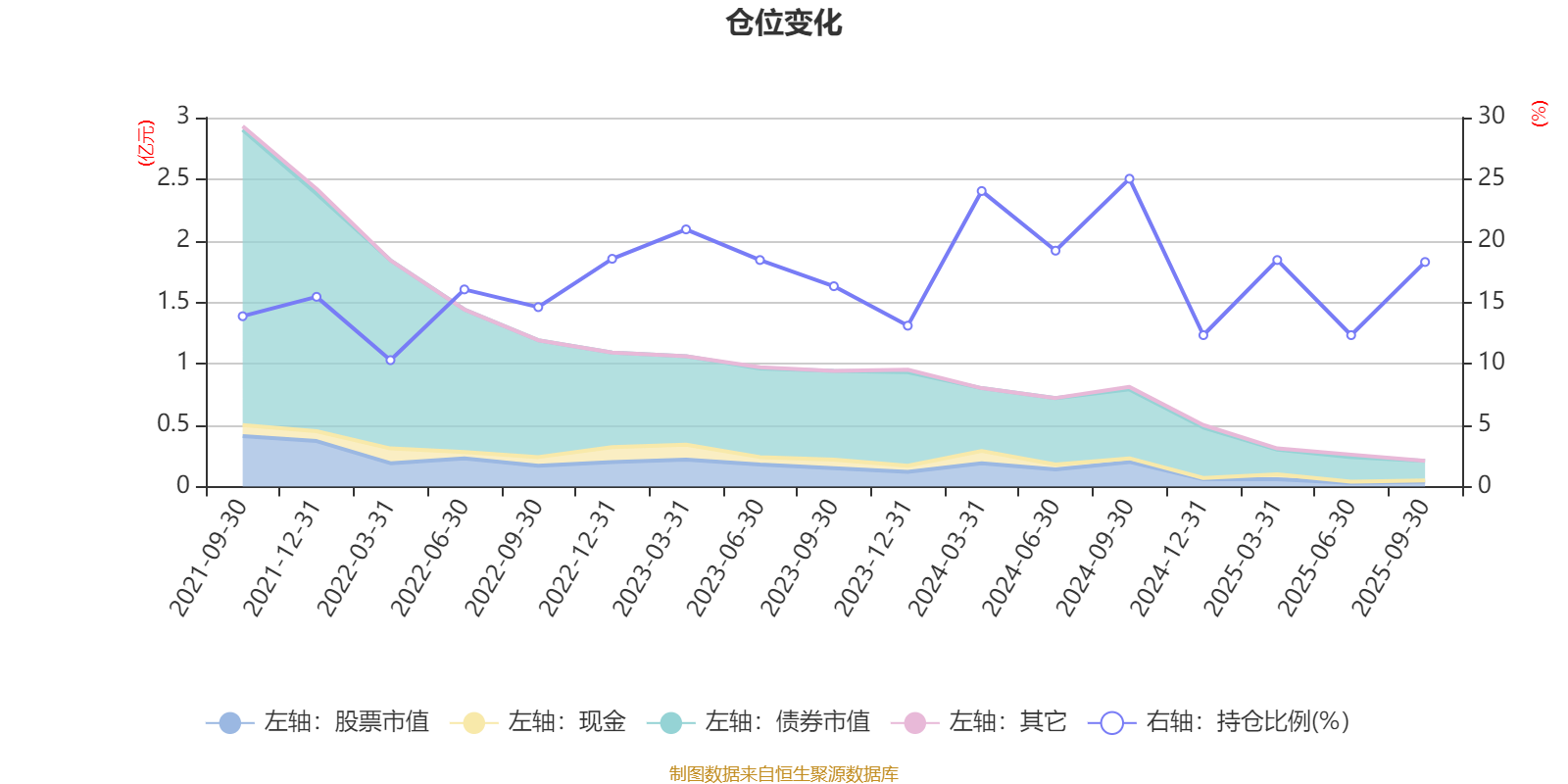 据定期报告数据统计,近三年平均股票仓位为18.06%,同类平均为19.14%。2024年三季度末基金达到25.03%的最高仓位,2022年一季度末最低,为10.28%。