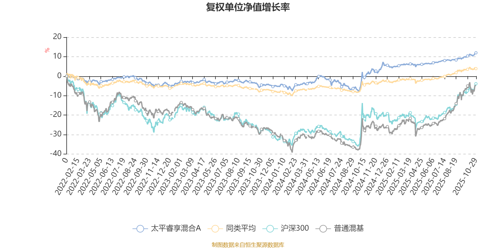 截至10月29日,太平睿享混合A近三个月复权单位净值增长率为3.59%,位于同类可比基金209/629;近半年复权单位净值增长率为5.64%,位于同类可比基金309/629;近一年复权单位净值增长率为10.41%,位于同类可比基金156/623;近三年复权单位净值增长率为18.00%,位于同类可比基金125/557。