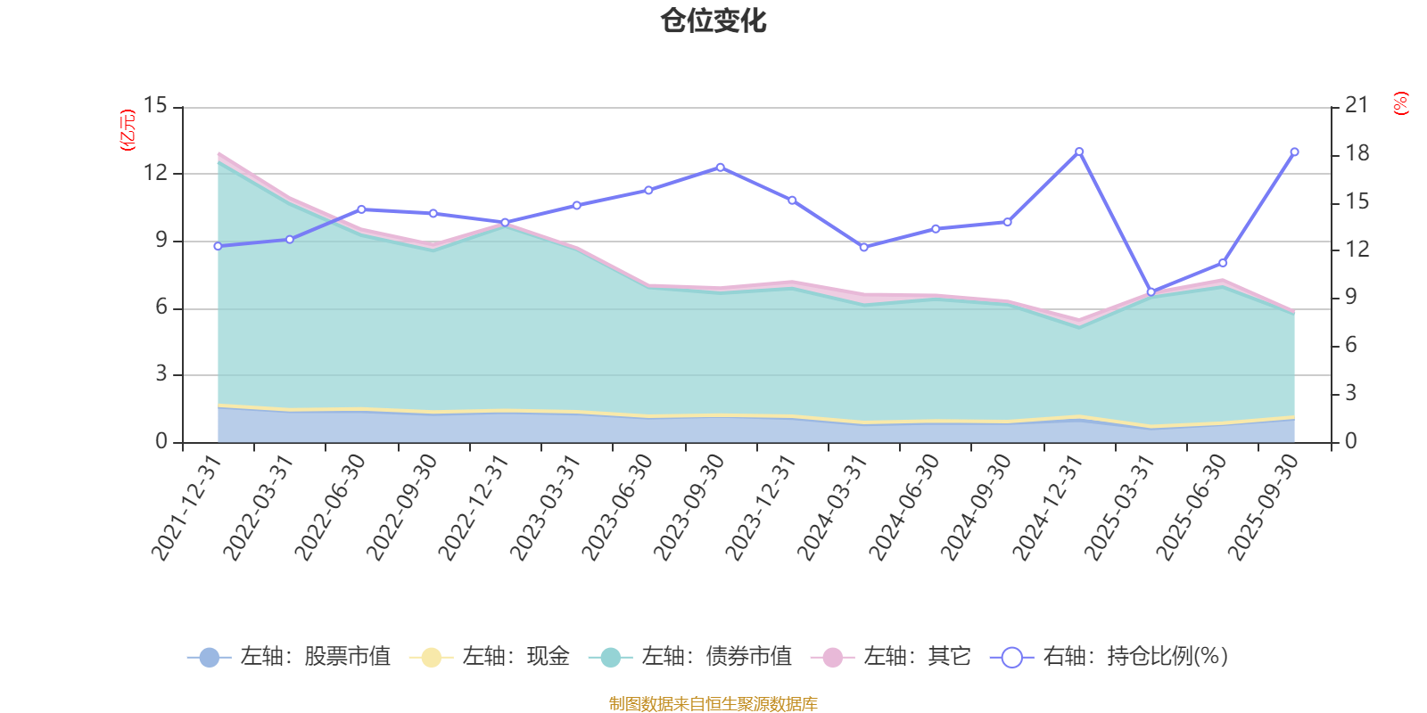 据定期报告数据统计,近三年平均股票仓位为14.44%,同类平均为19.14%。2024年末基金达到18.21%的最高仓位,2025年一季度末最低,为9.42%。
