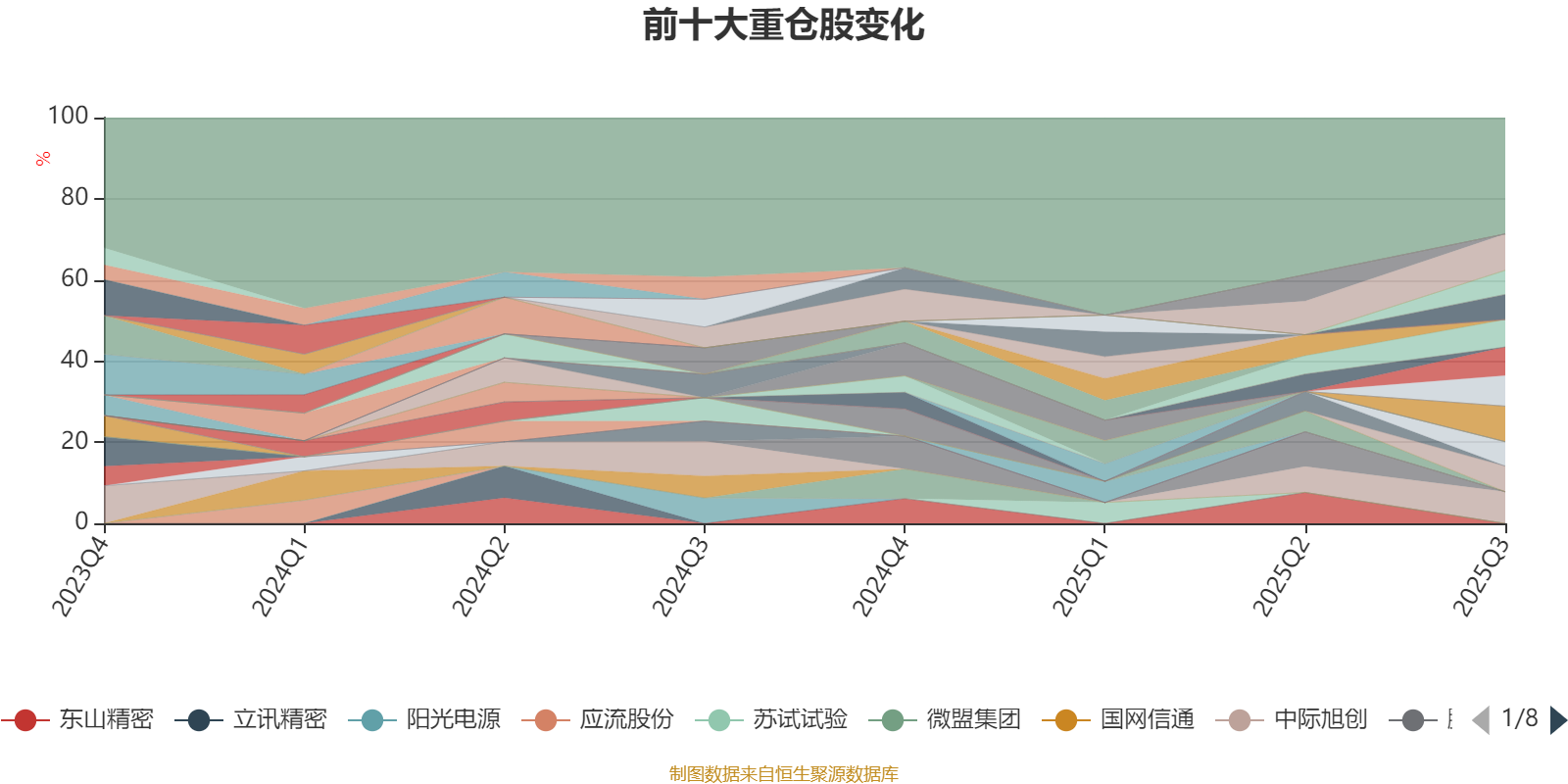 该基金持股集中度较高。截至2025年三季度末,基金十大重仓股分别是新易盛、寒武纪、中际旭创、宏和科技、海光信息、歌尔股份、世运电路、南亚新材、生益科技、高伟电子。