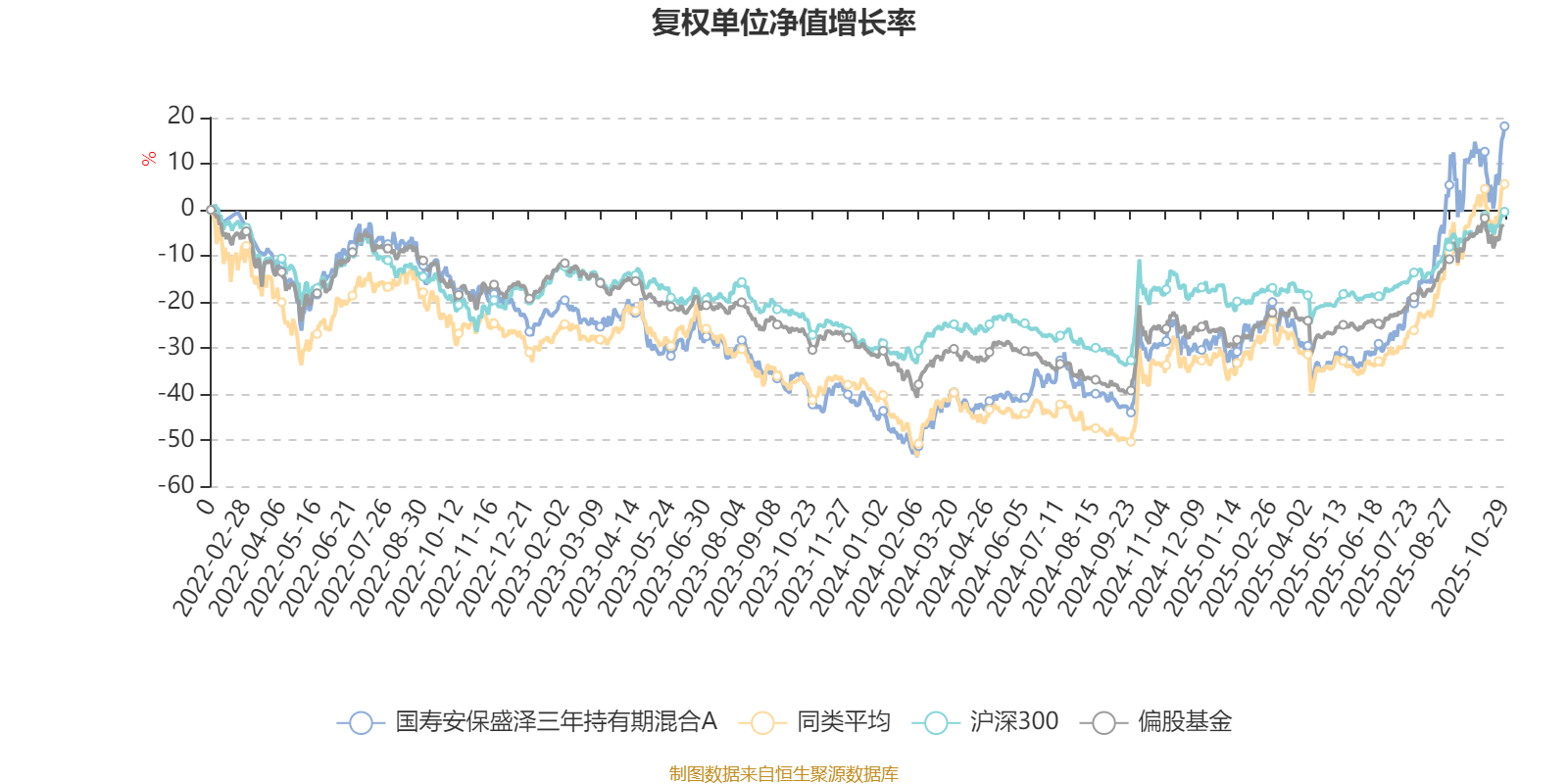 截至10月29日,国寿安保盛泽三年持有期混合A近三个月复权单位净值增长率为39.55%,位于同类可比基金92/229;近半年复权单位净值增长率为76.60%,位于同类可比基金65/229;近一年复权单位净值增长率为66.33%,位于同类可比基金75/213;近三年复权单位净值增长率为46.69%,位于同类可比基金82/158。