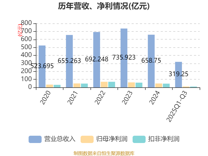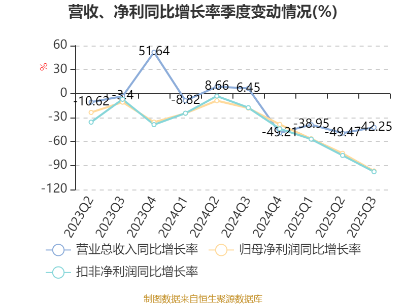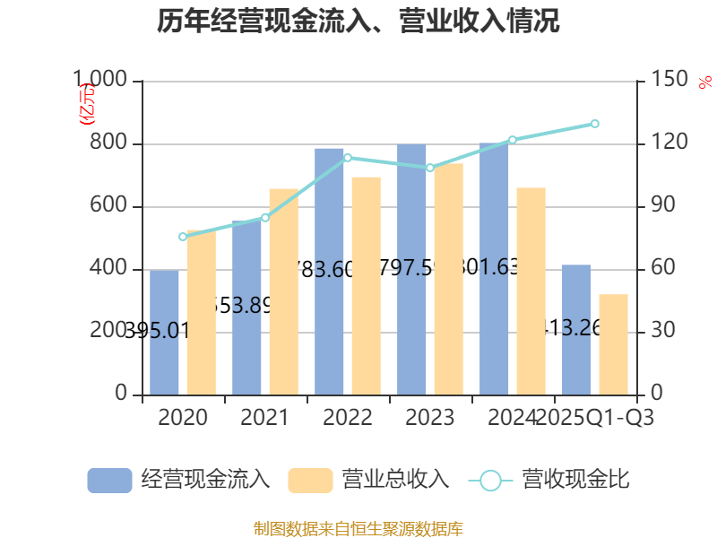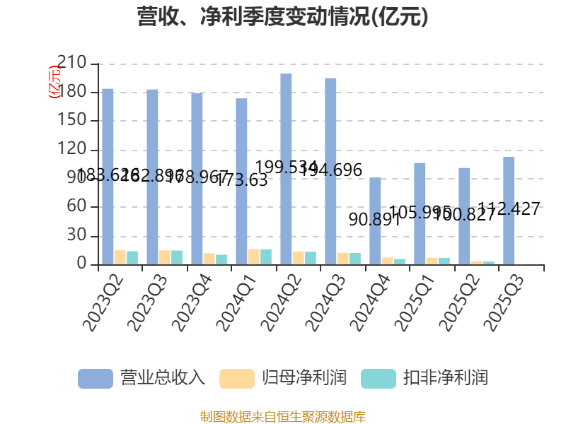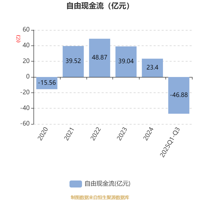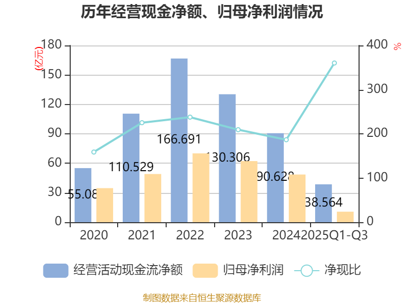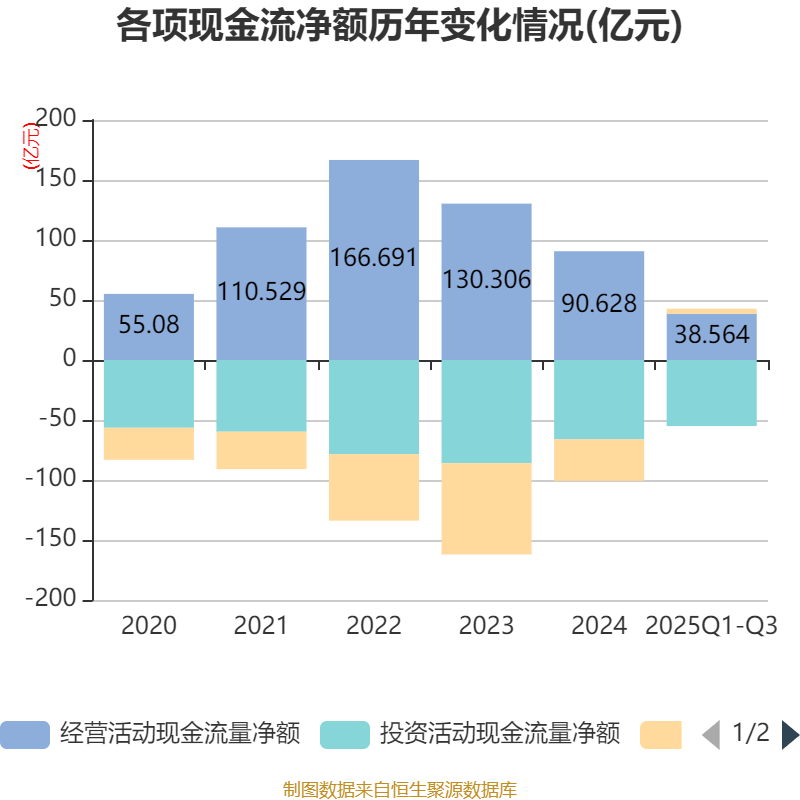 2025年前三季度,公司经营活动现金流净额为38.56亿元,同比下降50.49%;筹资活动现金流净额4.14亿元,同比增加41.44亿元;投资活动现金流净额-55.06亿元,上年同期为-37.29亿元。