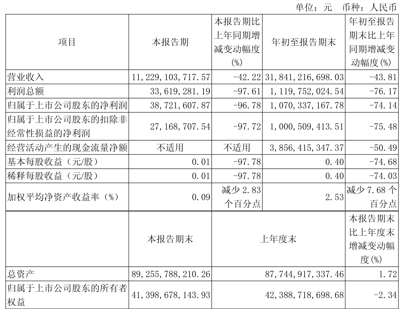 中证智能财讯淮北矿业(600985)10月31日披露2025年第三季度报告。前三季度公司实现营业总收入319.25亿元,同比下降43.78%;归母净利润10.7亿元,同比下降74.14%;扣非净利润10.01亿元,同比下降75.48%;经营活动产生的现金流量净额为38.56亿元,同比下降50.49%;报告期内,淮北矿业基本每股收益为0.4元,加权平均净资产收益率为2.53%。