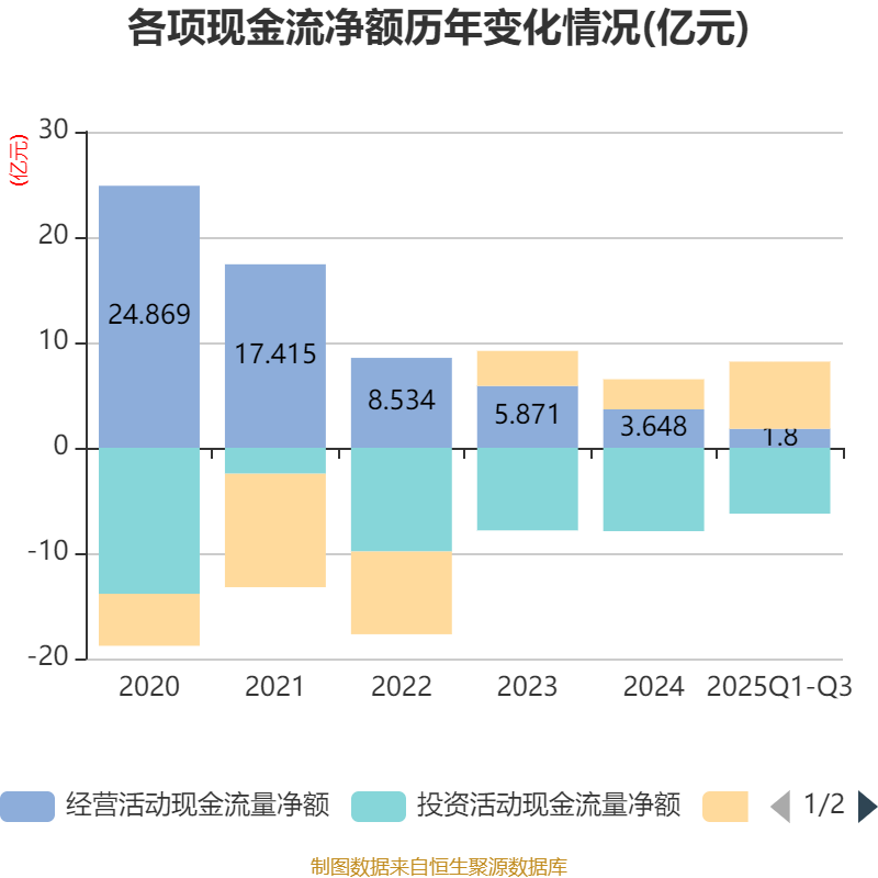 2025年前三季度,公司经营活动现金流净额为1.8亿元,同比增长15.73%;筹资活动现金流净额6.38亿元,同比增加1.68亿元;投资活动现金流净额-6.25亿元,上年同期为-7.19亿元。