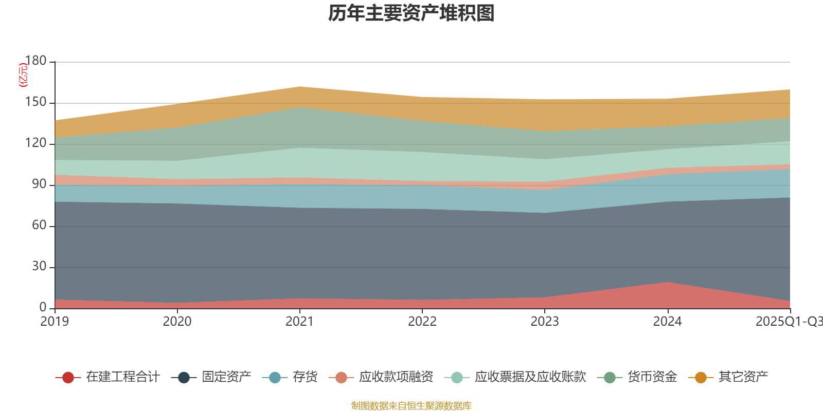资产重大变化方面,截至2025年三季度末,公司在建工程合计较上年末减少72.28%,占公司总资产比重下降9.19个百分点;固定资产较上年末增加28.61%,占公司总资产比重上升8.9个百分点;应收票据及应收账款较上年末增加23.21%,占公司总资产比重上升1.6个百分点;应收款项融资较上年末减少23.78%,占公司总资产比重下降0.83个百分点。