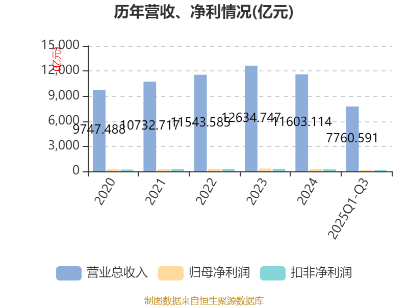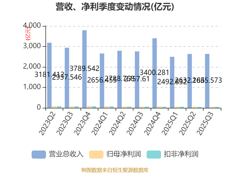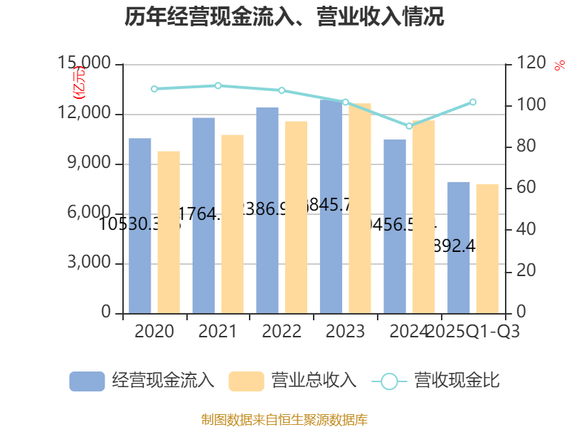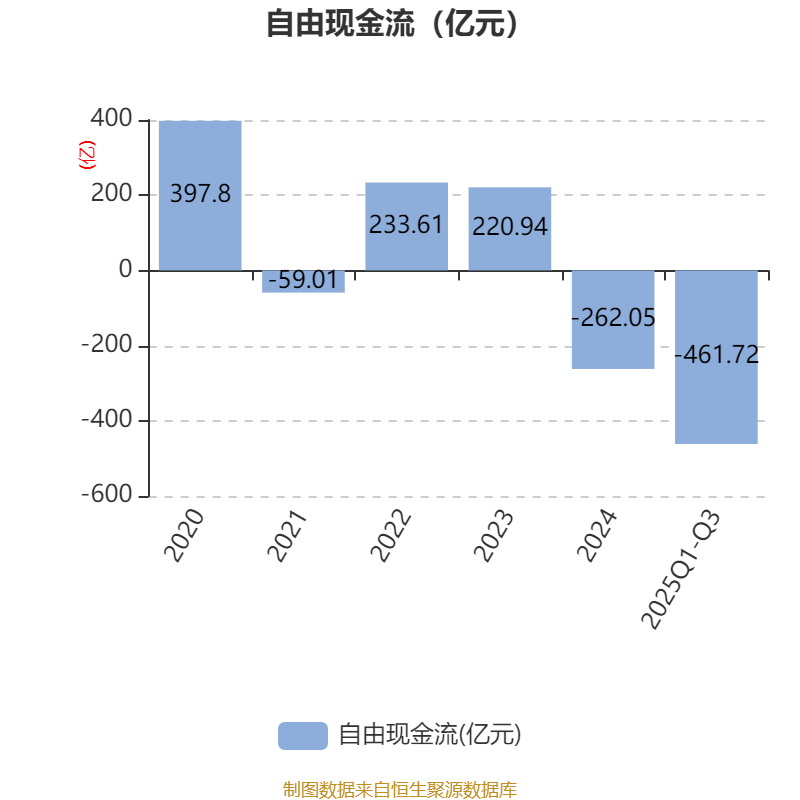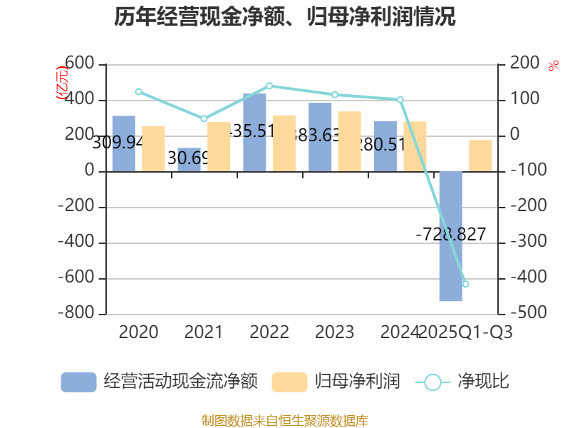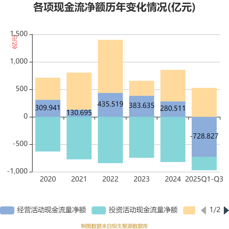 2025年前三季度,公司经营活动现金流净额为-728.83亿元,同比减少16.25亿元;筹资活动现金流净额525.93亿元,同比减少168.88亿元;投资活动现金流净额-243.07亿元,上年同期为-368.11亿元。