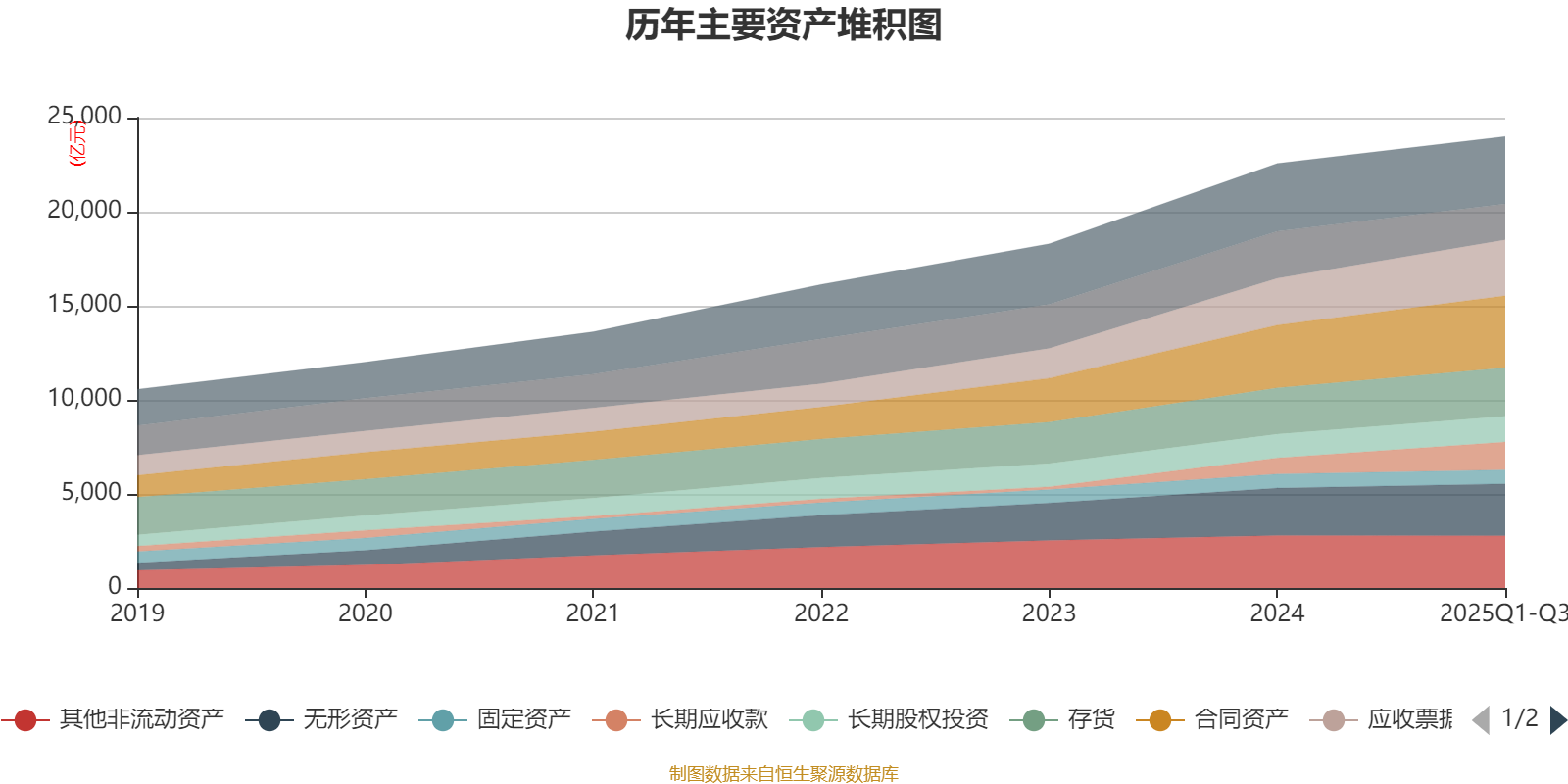 资产重大变化方面,截至2025年三季度末,公司货币资金较上年末减少23.4%,占公司总资产比重下降3.1个百分点;长期应收款较上年末增加72.38%,占公司总资产比重上升2.36个百分点;应收票据及应收账款较上年末增加19.87%,占公司总资产比重上升1.4个百分点;合同资产较上年末增加14.98%,占公司总资产比重上升1.2个百分点。
