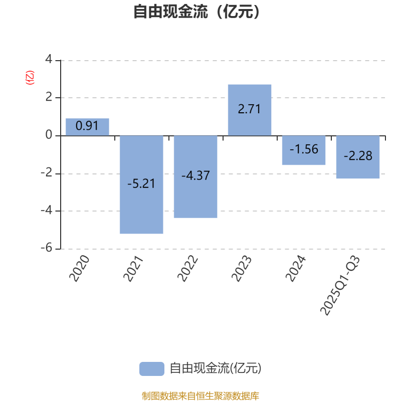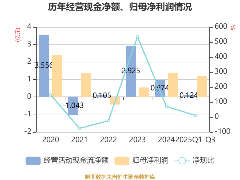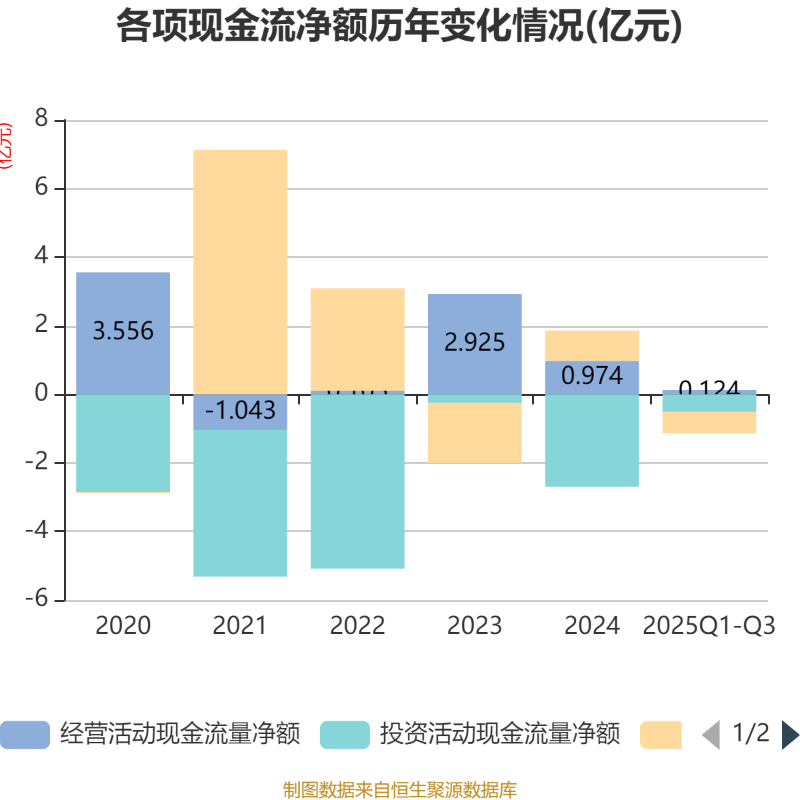 2025年前三季度,公司经营活动现金流净额为1244.11万元,同比增加1.77亿元;筹资活动现金流净额-6295.26万元,同比减少2.68亿元;投资活动现金流净额-5118.99万元,上年同期为-1.49亿元。