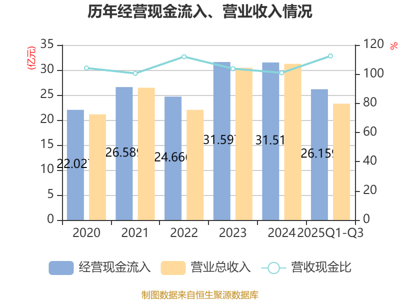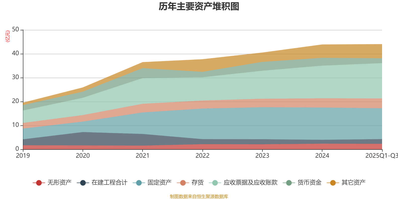 资产重大变化方面,截至2025年三季度末,公司货币资金较上年末减少38.28%,占公司总资产比重下降2.88个百分点;应收票据及应收账款较上年末增加8.06%,占公司总资产比重上升2.41个百分点;固定资产较上年末减少4.58%,占公司总资产比重下降1.51个百分点;交易性金融资产合计较上年末减少56.53%,占公司总资产比重下降1.49个百分点。