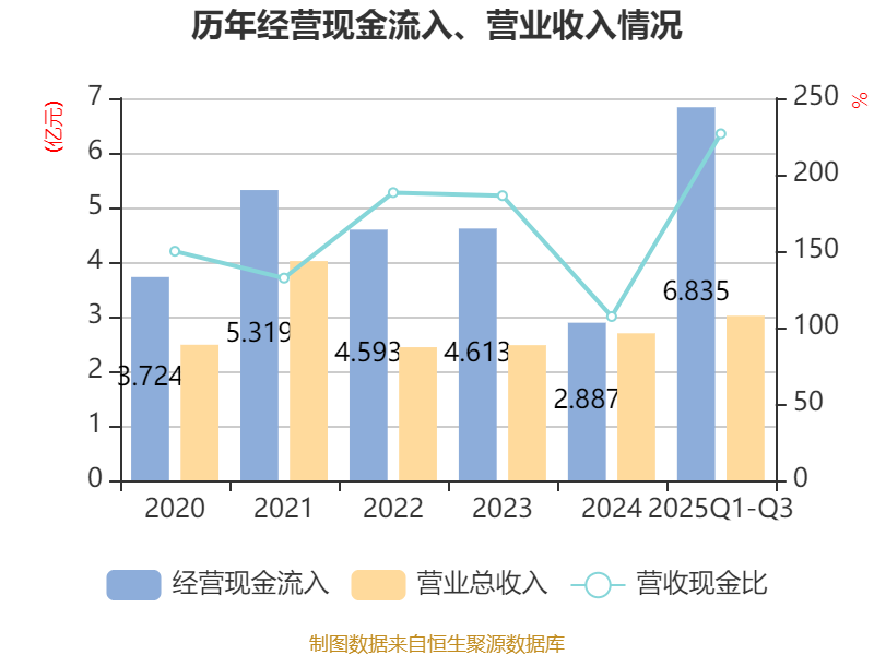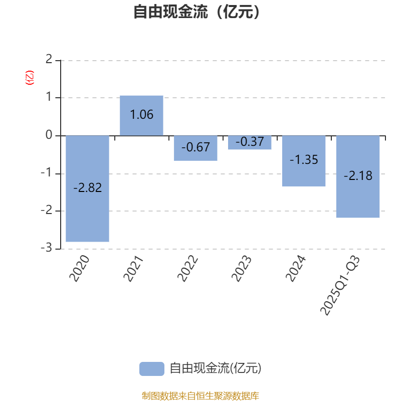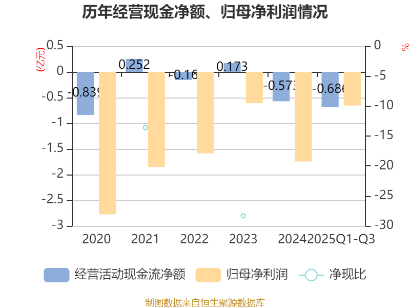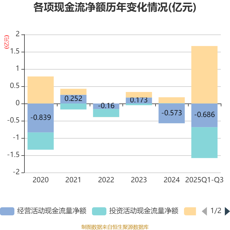 2025年前三季度,公司经营活动现金流净额为-6859.15万元,同比增加2188.87万元;筹资活动现金流净额1.67亿元,同比增加1.32亿元;投资活动现金流净额-8945.88万元,上年同期为2913.32万元。